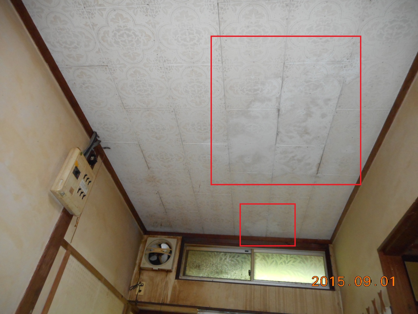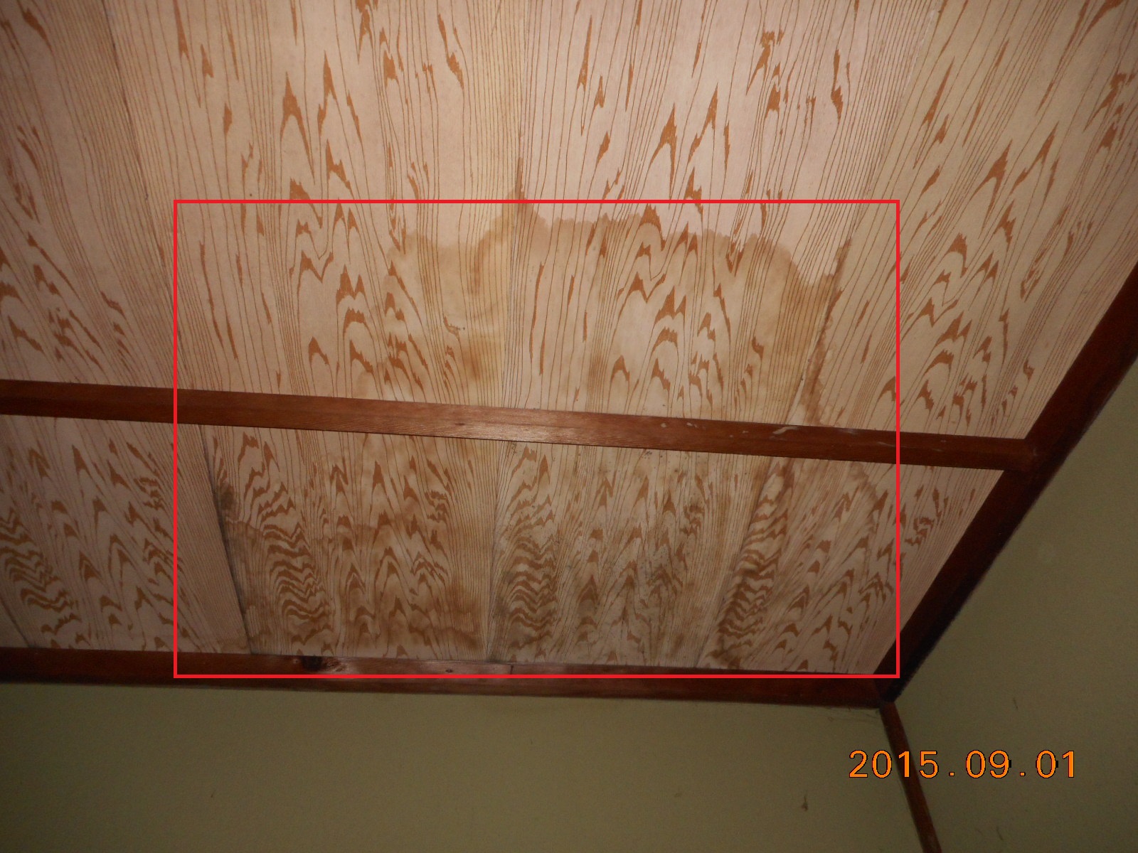 | 室内の天井には雨漏れの跡が(赤線で囲った部分)!! | こちらの部屋の天井も!! |