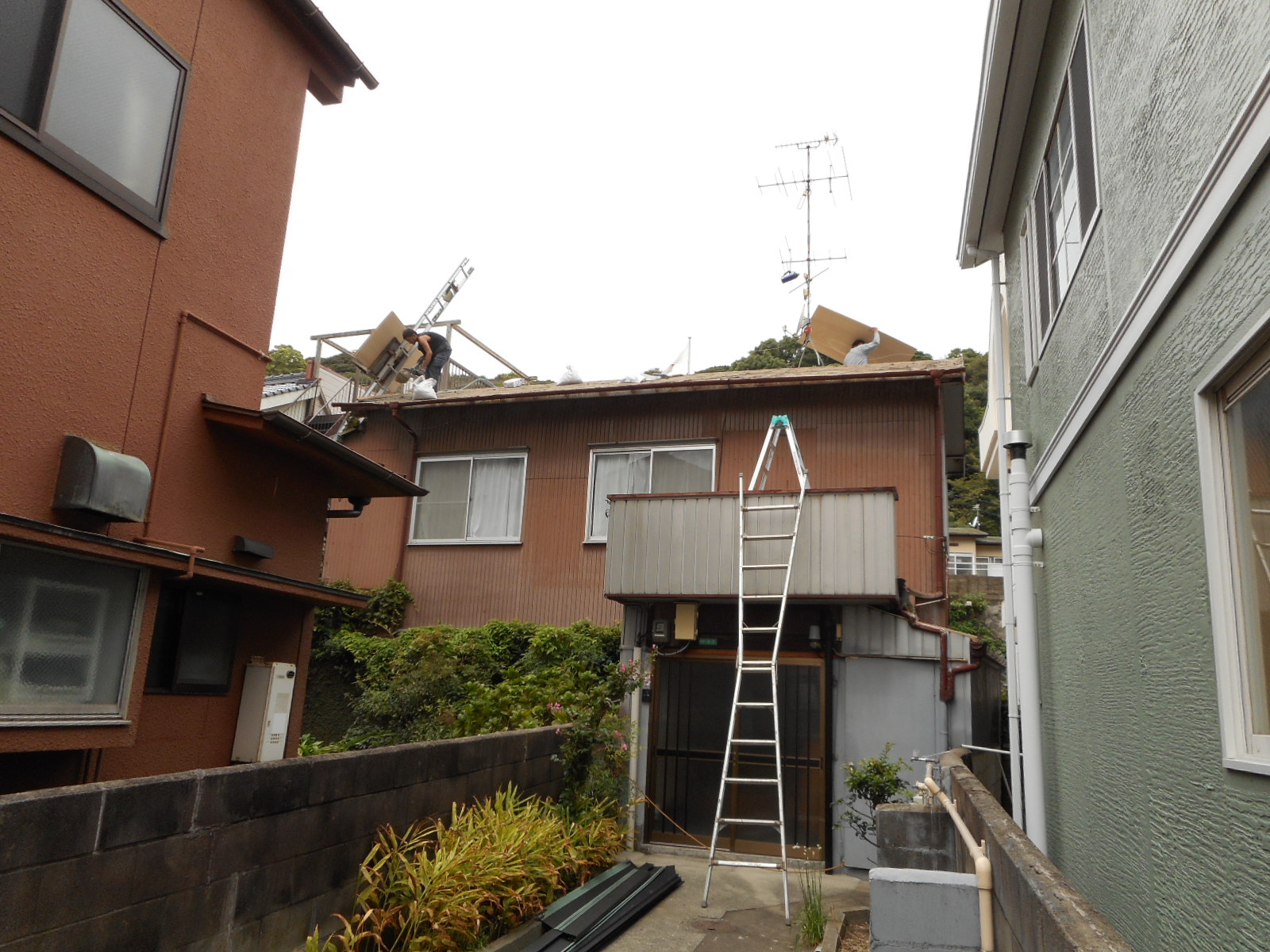 | 既存の瓦の撤去が終わりました!! | 下地コンパネを張り、ルーフィングを施工しています!! |