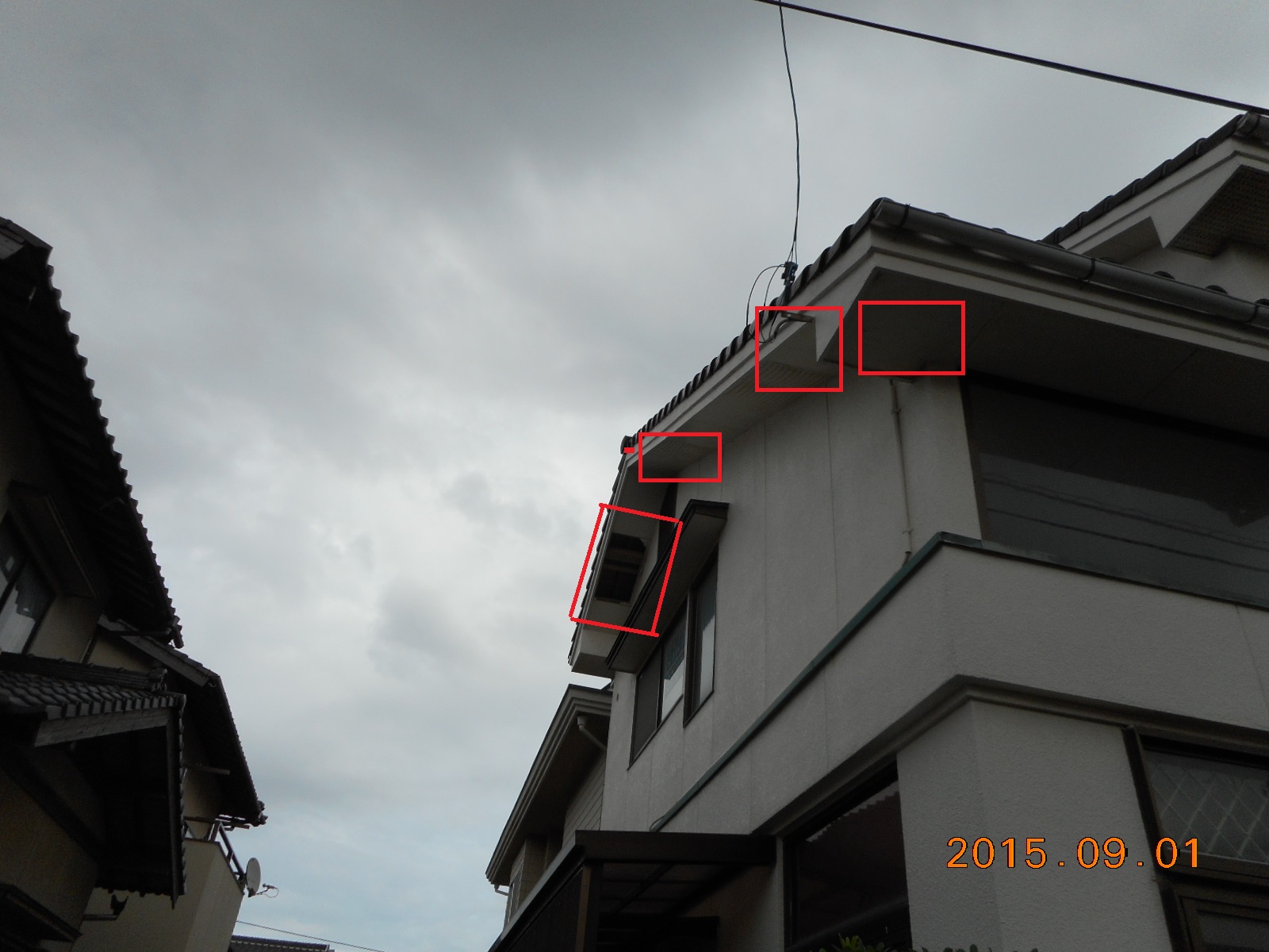 赤線で囲った有孔の軒天が一部は完全に崩落し、その他の有孔の軒天も水を含んで膨らんでおり