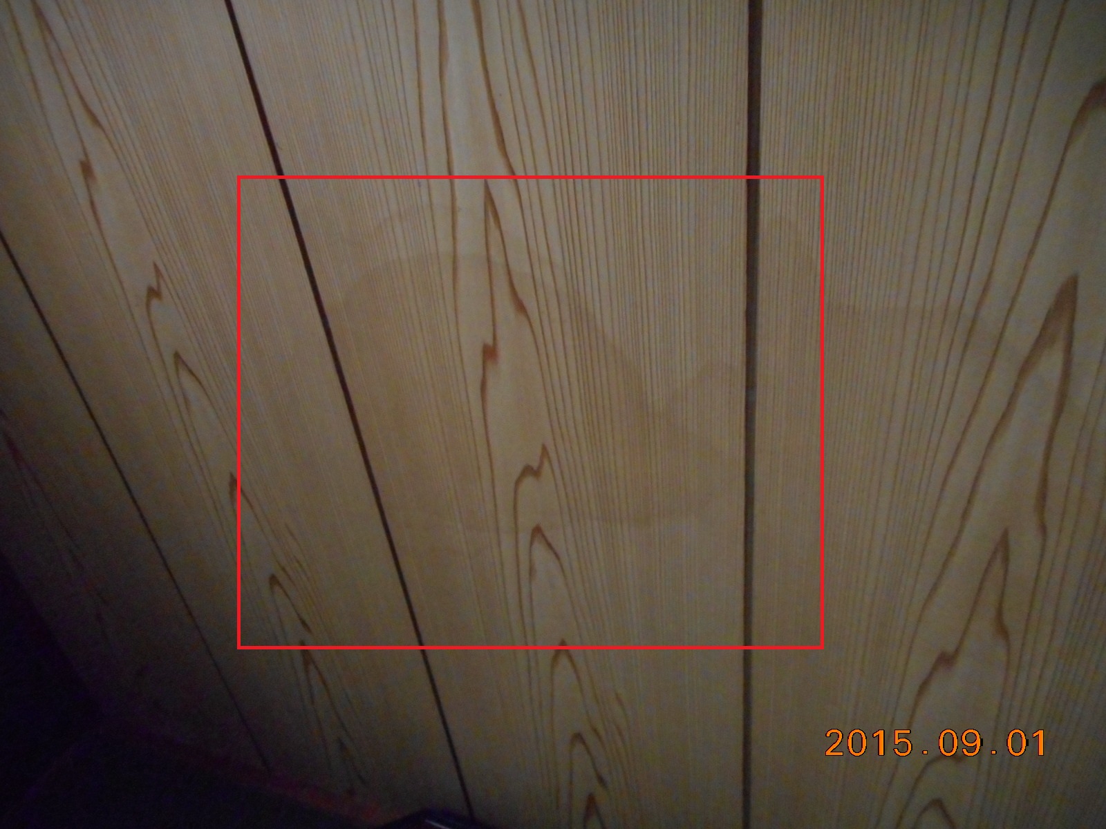 和室の天井のも雨漏れの跡が(赤線で囲った部分)!! |