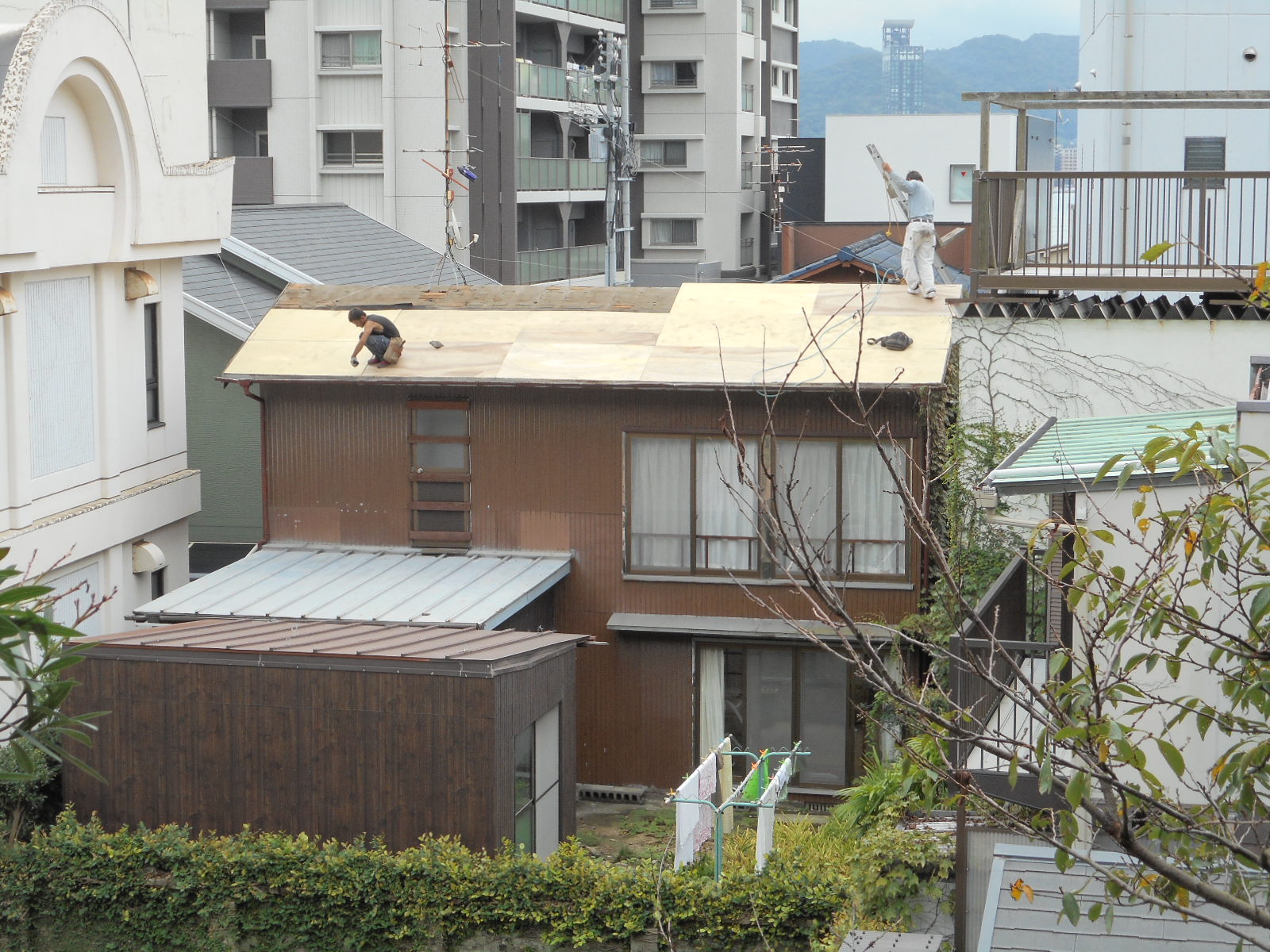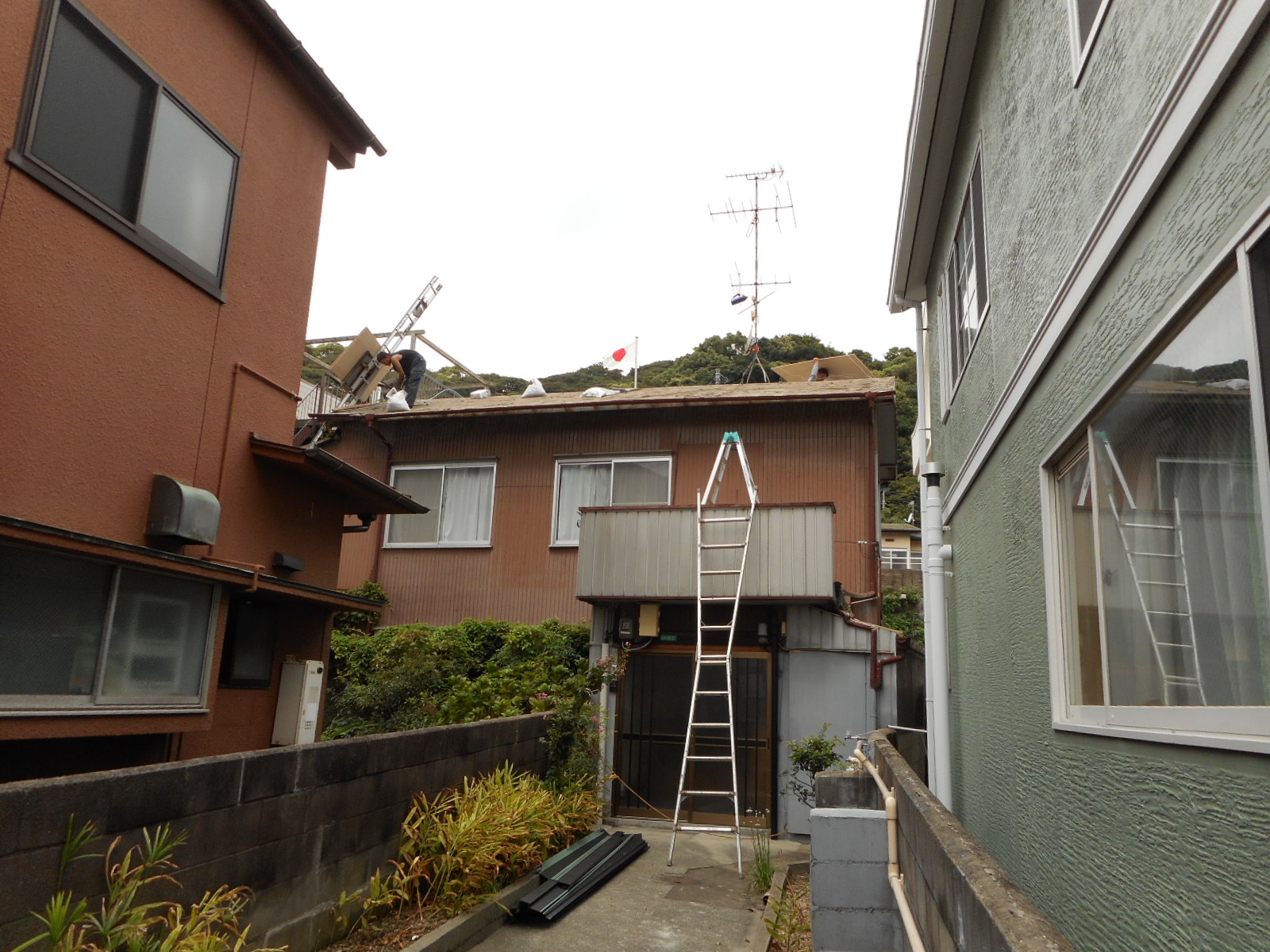 正面玄関の上も張り替えます!! 既存の瓦を撤去後、下地づくりをし新規の瓦を施工して行きます(お隣の屋敷から見る)!!