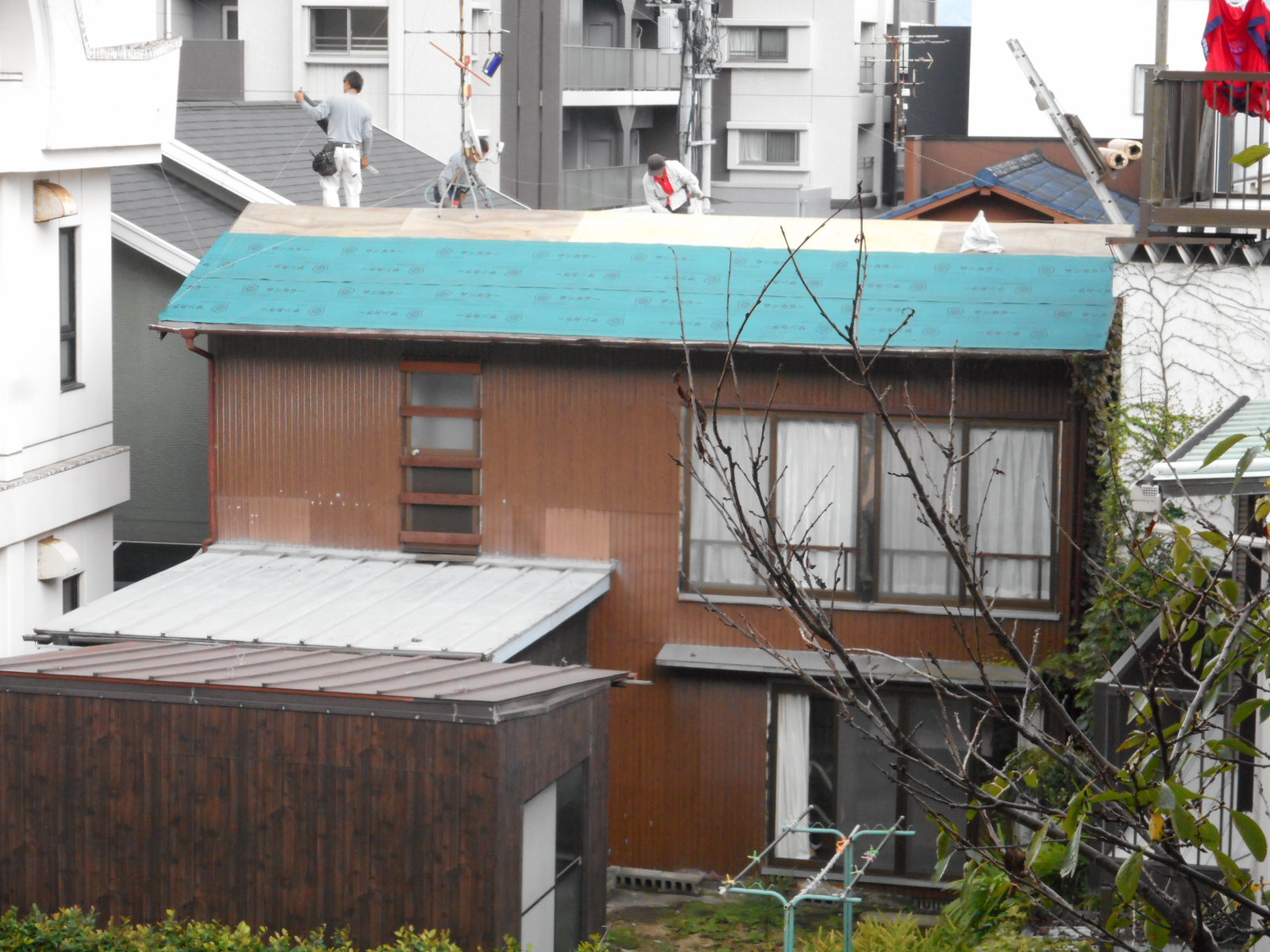 既存の瓦の撤去後、下地コンパネを施工します!! つづいてアスファルト・ルーフィングを張ります!!