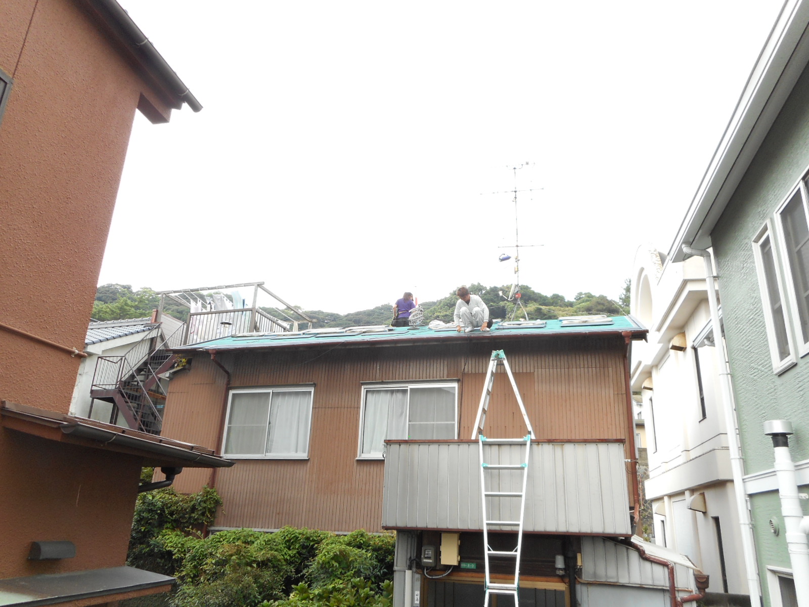 横のお隣の屋敷を借りて、材料を運び上げました!! 正面の屋根の上に新規の瓦)を搬入の完了です!!