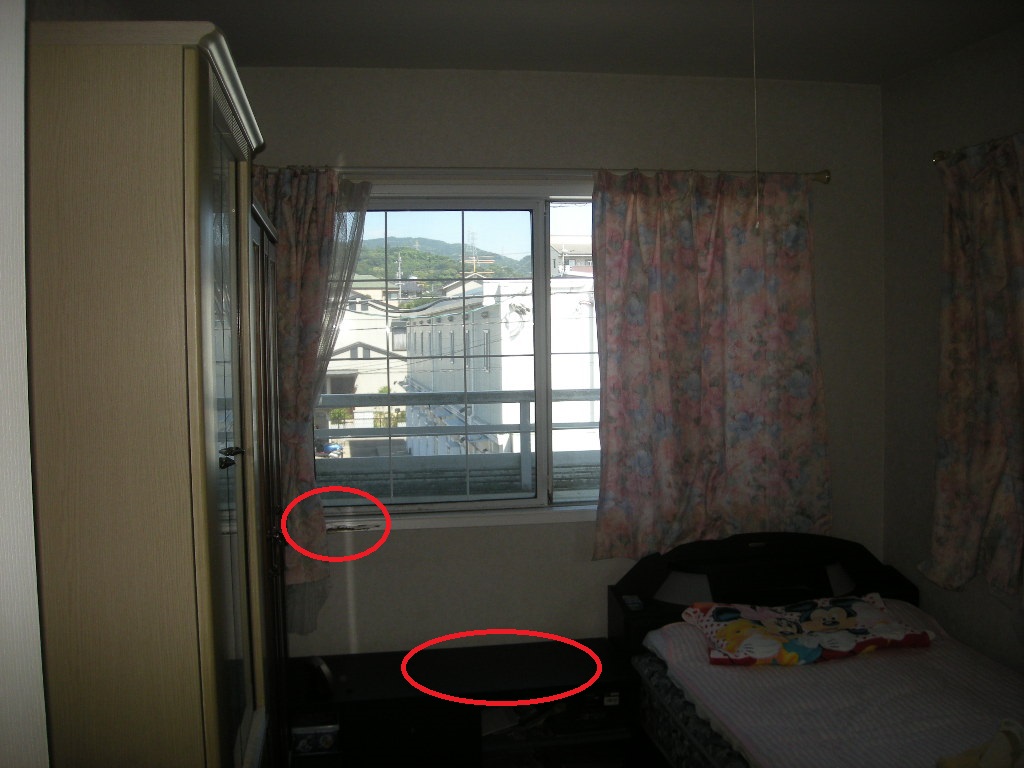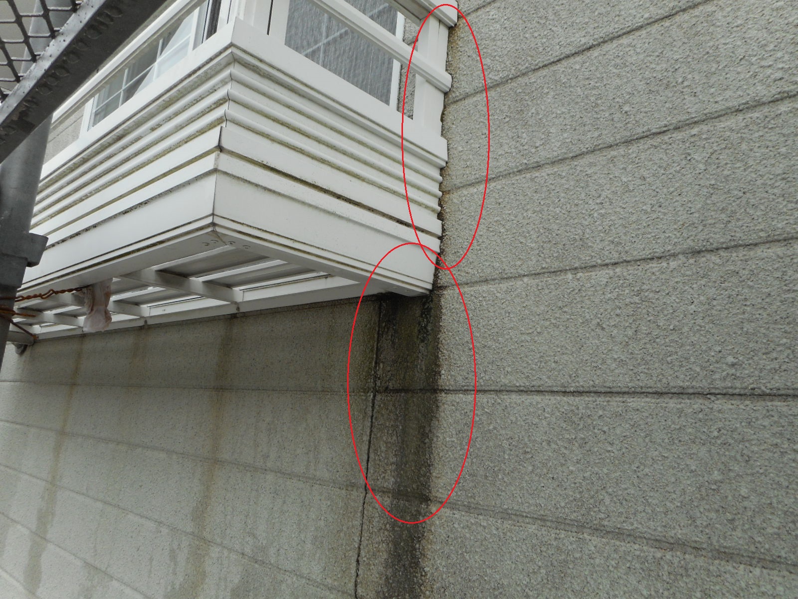 | 3Fの手すり廻りの赤○で囲った部分に亀裂があります!! | 2Fの出窓廻りにも、いたるところに亀裂があります!! |