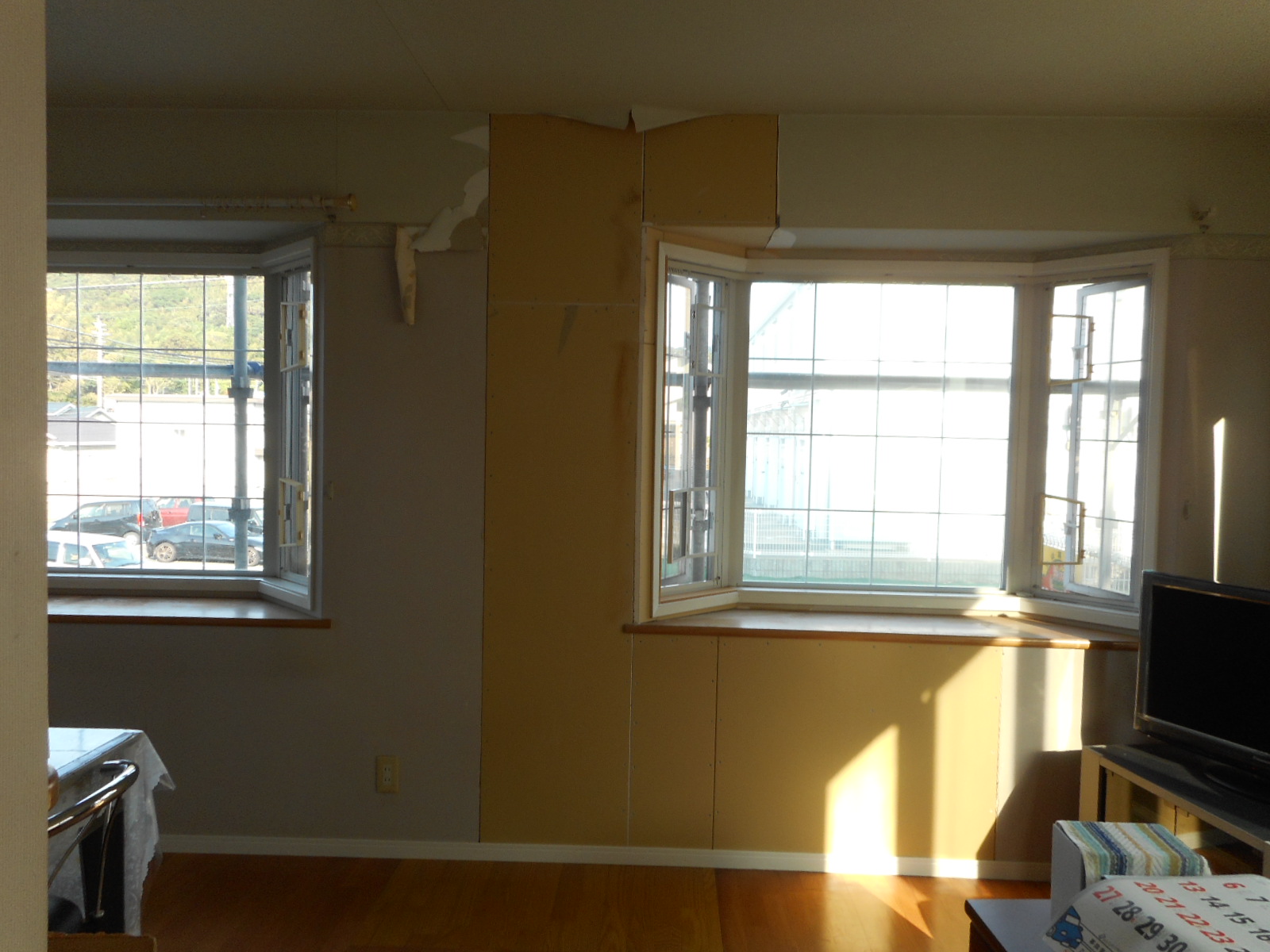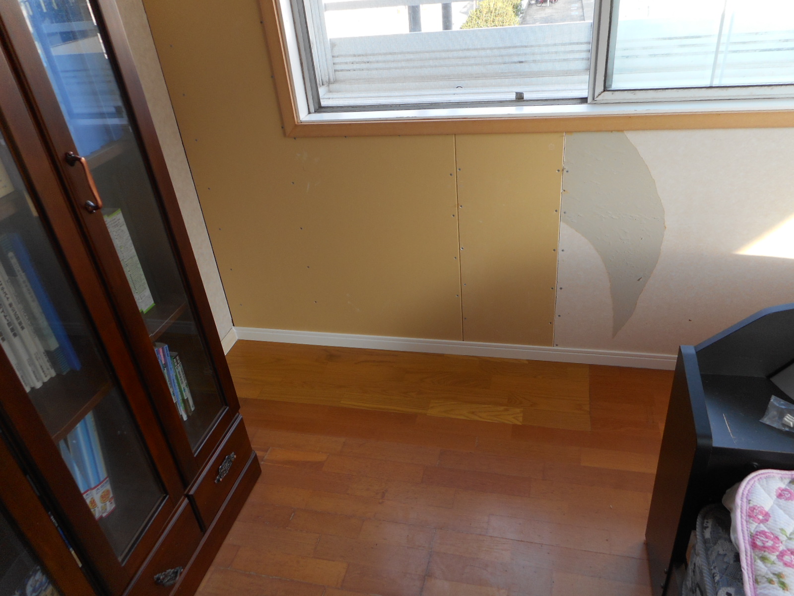| 壁の一部を開口し、下地づくり後クロス下地のボードを張りサッシ枠も一部交換します!! | 床も状態の悪い部分のみ張替えました(若干色が違いますが施主さんも了承済みです)!! |