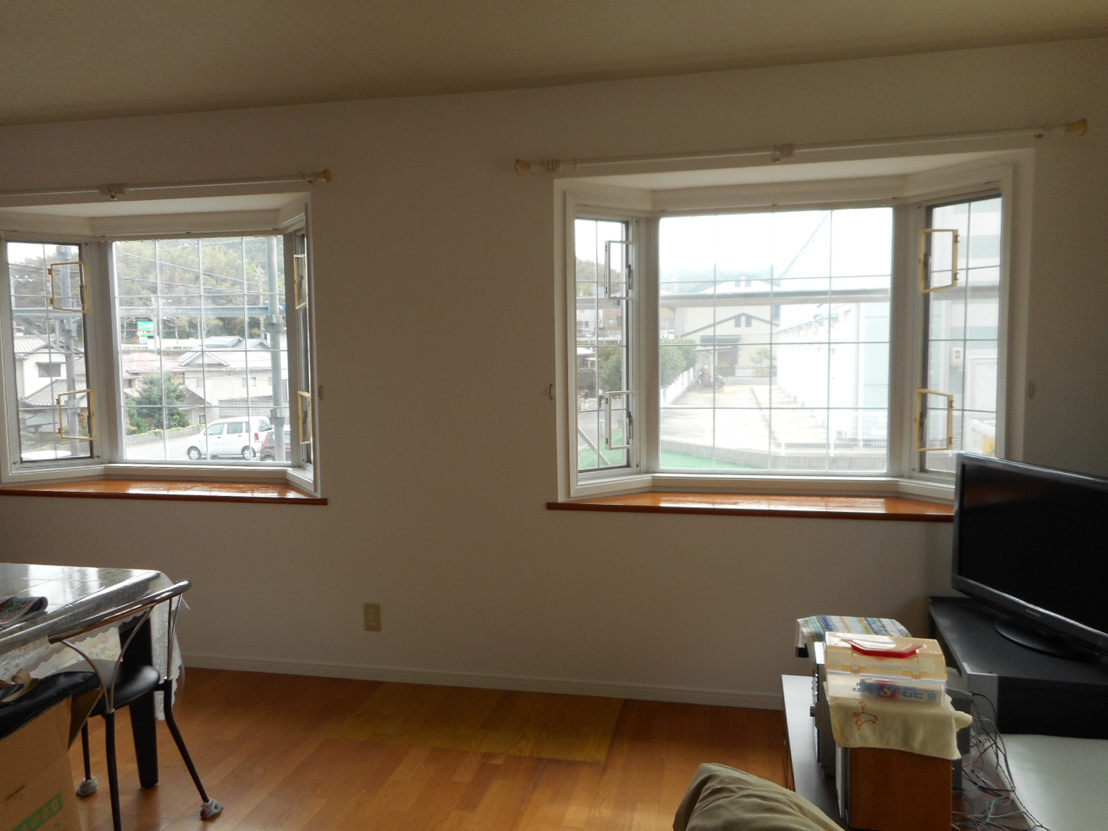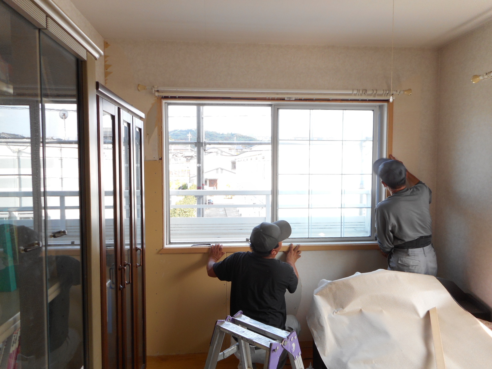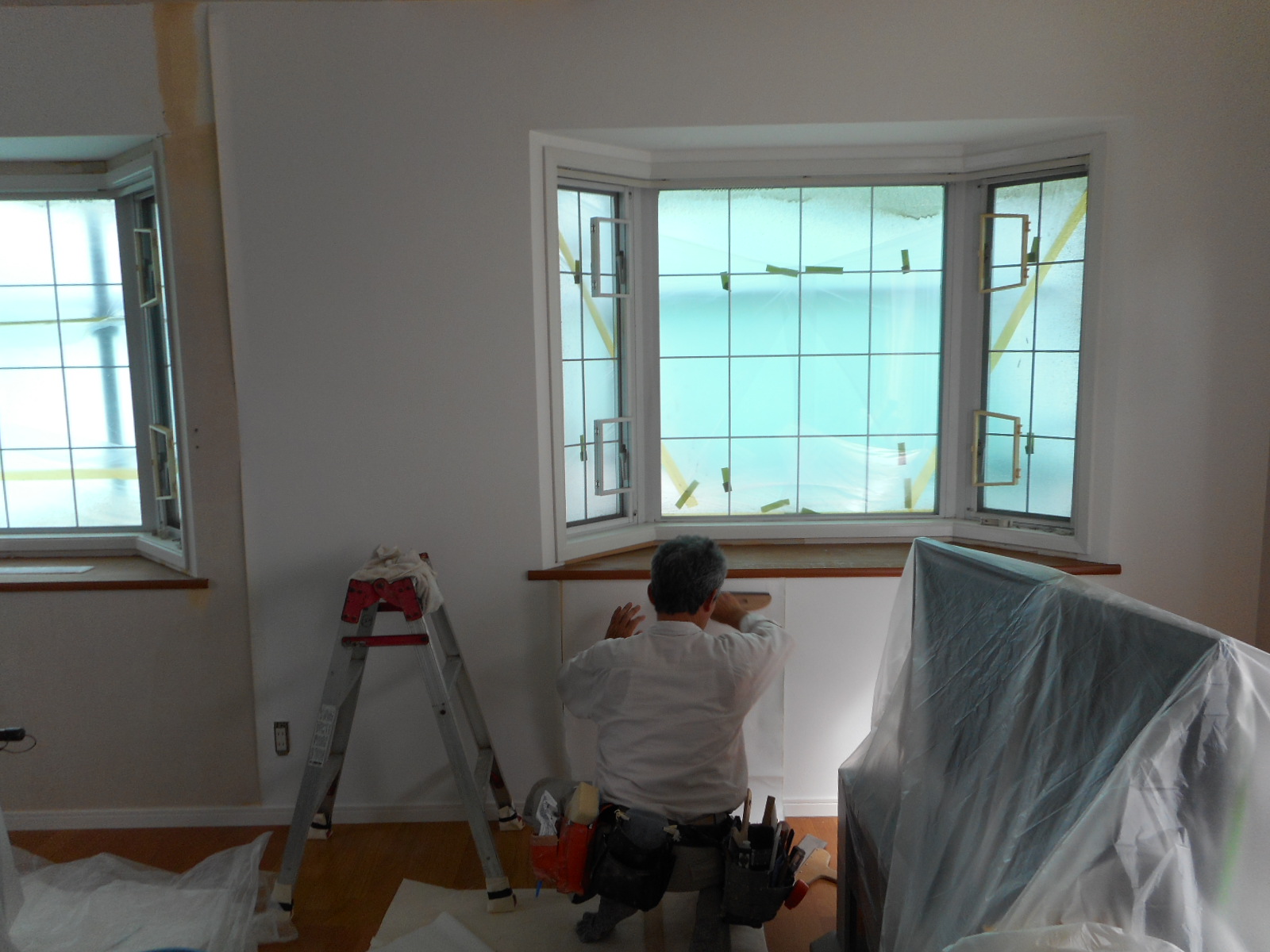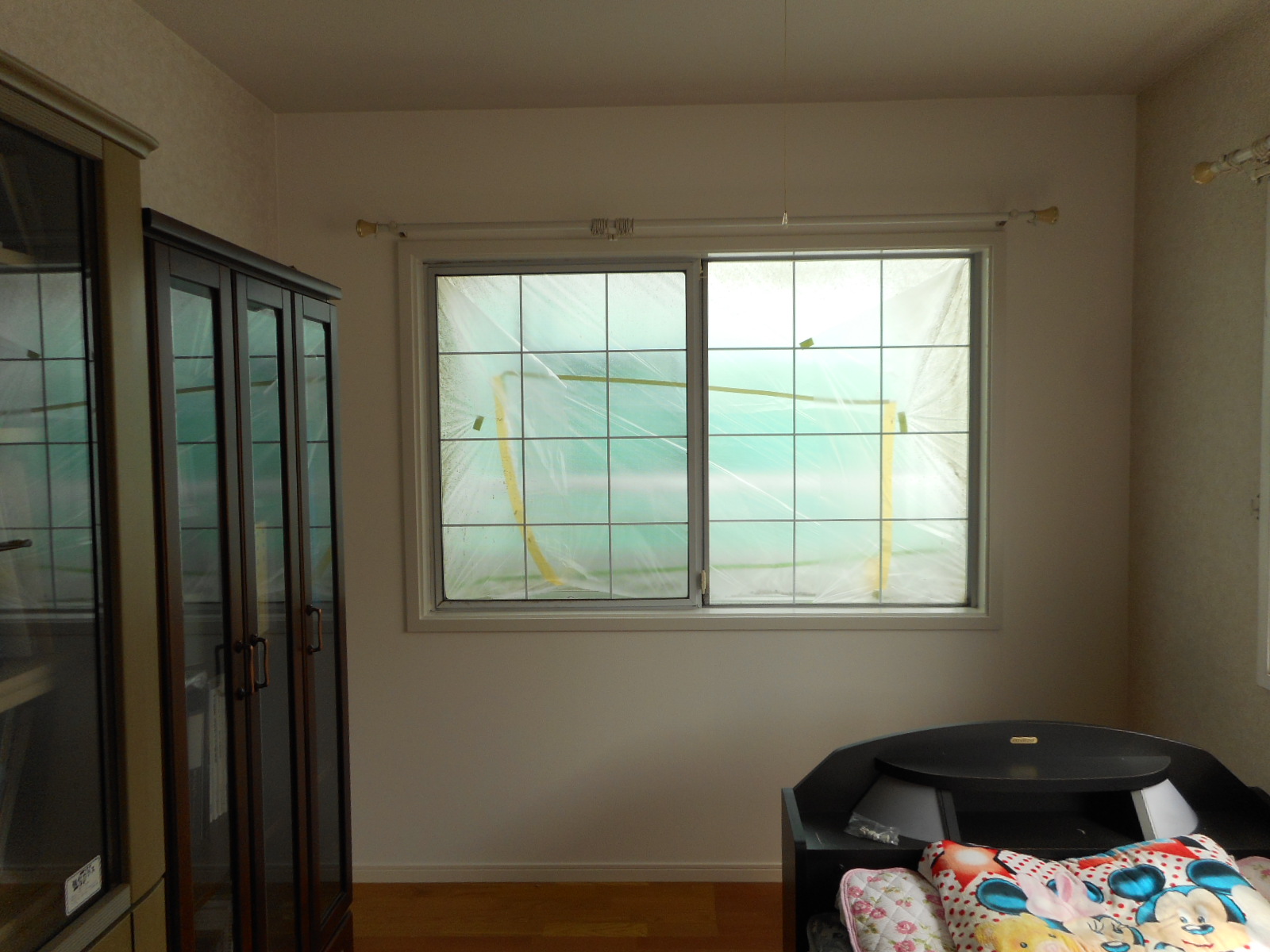 サッシの枠廻りも塗装し、クロスを張って3Fの補修工事の完了です(外では塗装工事をしていますのでサッシ廻りには養生がされています)!!