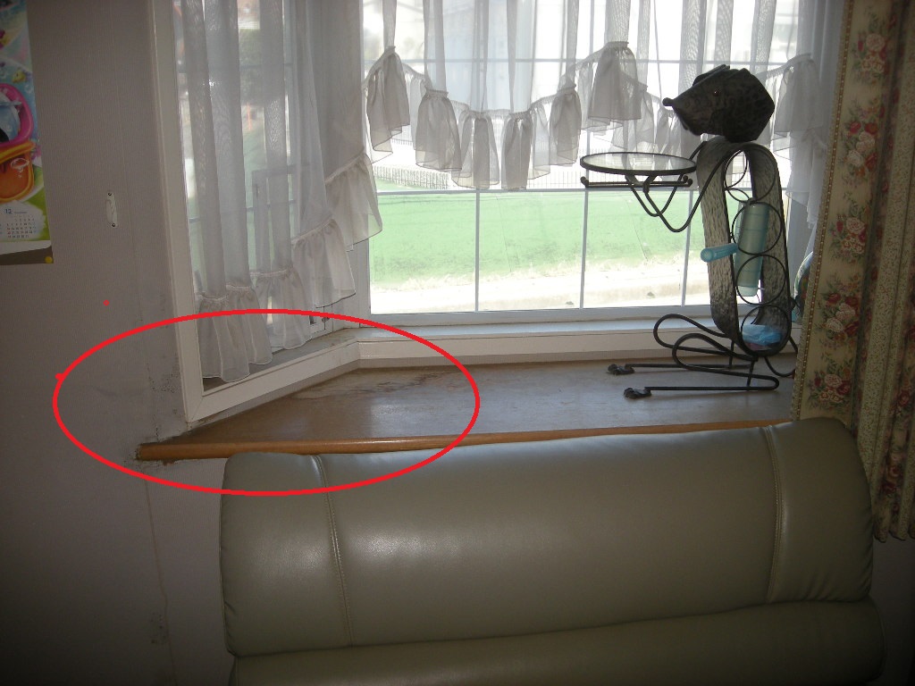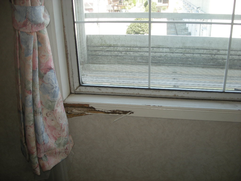 サッシや手すり廻りから進入した雨で、赤○で囲った部分がシロアリにも食われ、かなり悪い状態です!!