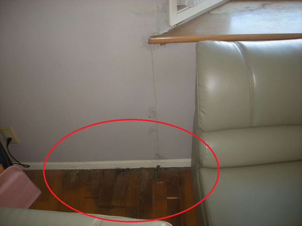 | 出窓のカウンター廻りも、外からの雨の進入で状態が良く有りませんん!! | カウンターの下の床も、雨とシロアリの被害で状態が良くありません!! |