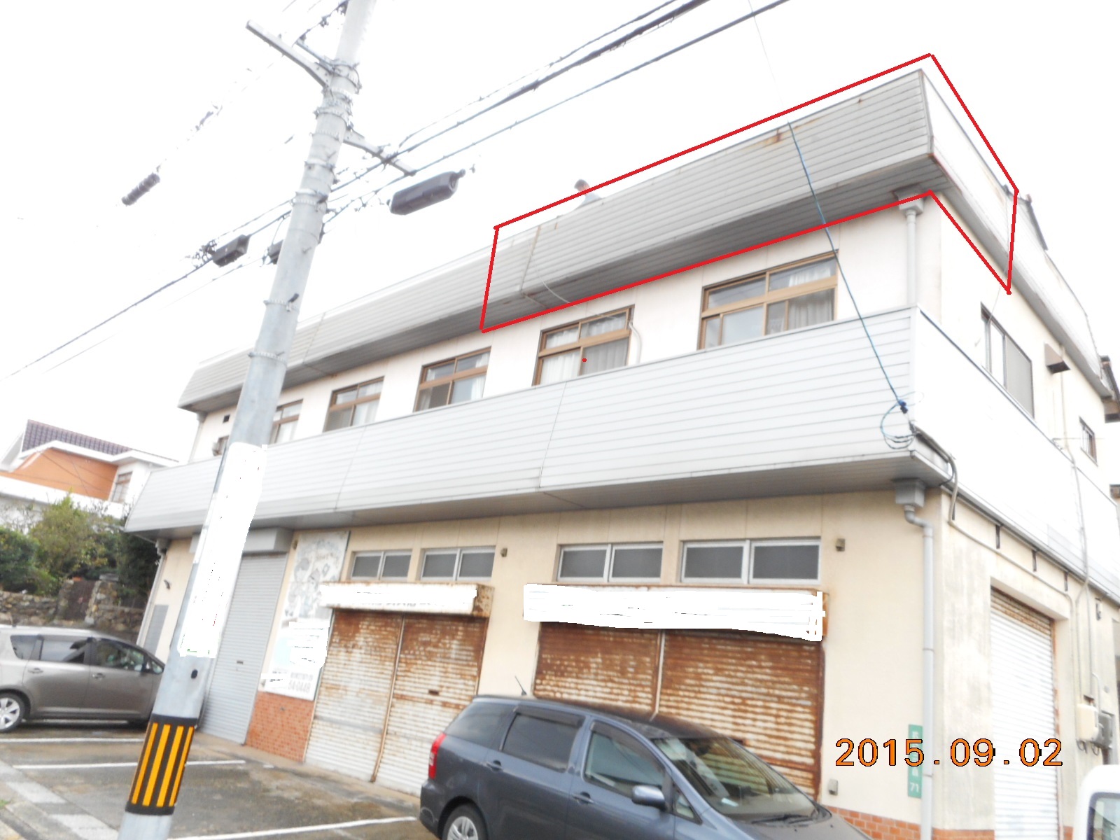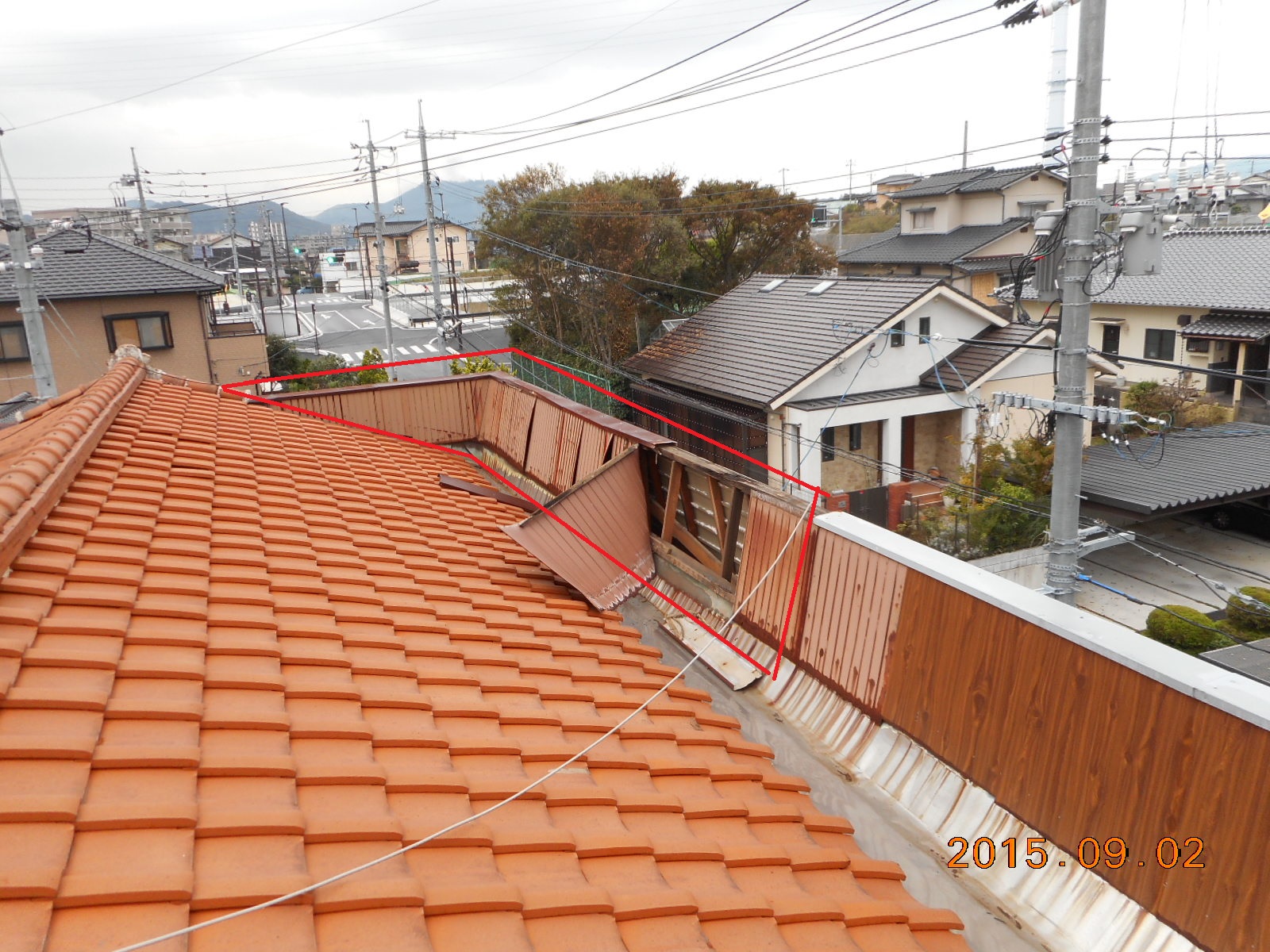 赤線で囲った部分の笠木の板金と内側のヨドプリントが台風被害によって剥がれました!!