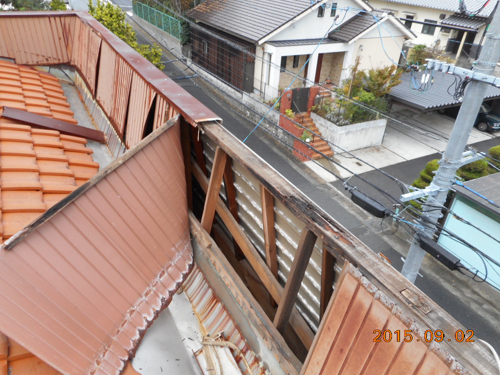 屋根に上がり内側を見ると、ご覧の状態です(右半分は以前修理した形跡があります)!!