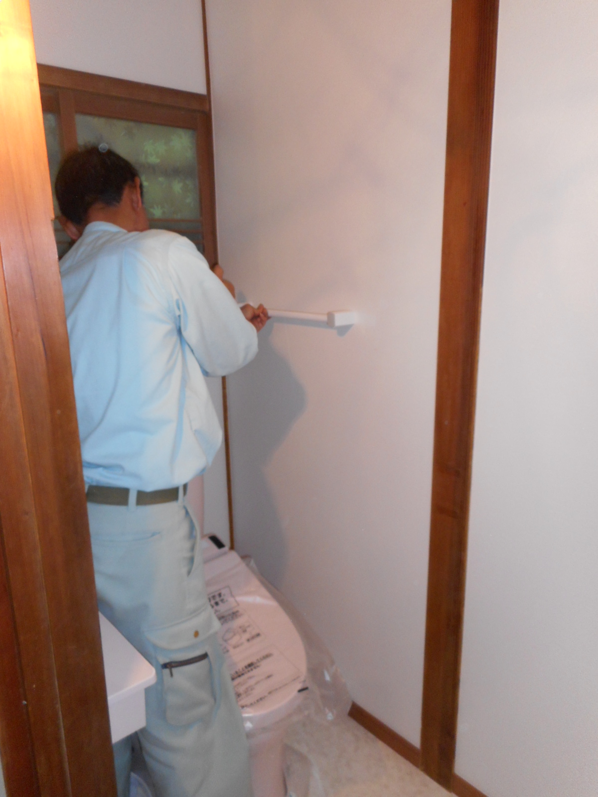 | つづいて設備屋さんが、便器やタオル掛けを組付けます!! | 70歳後半のお母さんのために、手すりも取付けます!! |