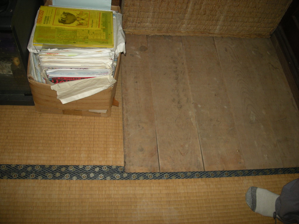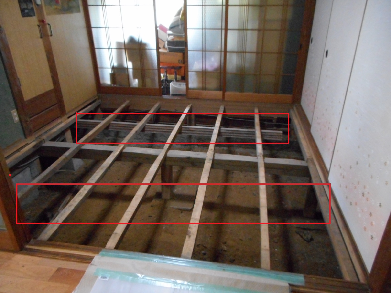 | 畳と座板を撤去して見ると、上の赤線で囲った部分は、まったく用を足さない切れっ端の様な材料が施工され、下の赤線部分は本来有るはずの大引きがありません!! | 赤線部分に新規に大引きを施工します!! |