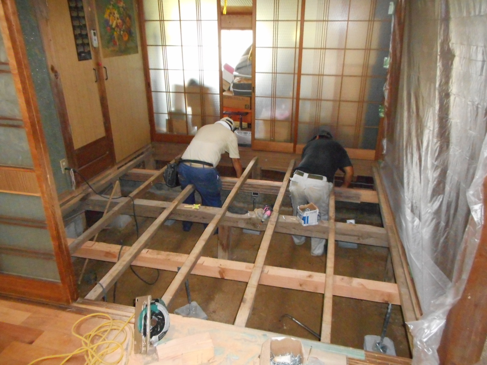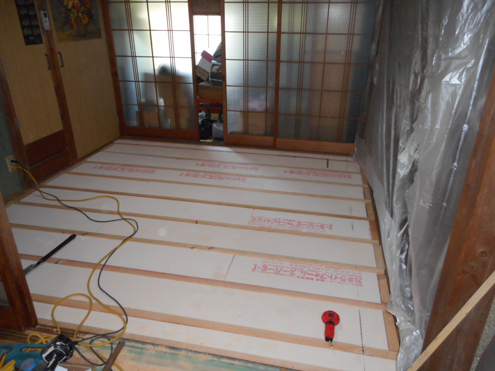 | 大引きの上にコンパネを施工し、その上に根太を施工後間に断熱材(カネライト40)を入れました!! | フロア材を施工し、完成です!! |