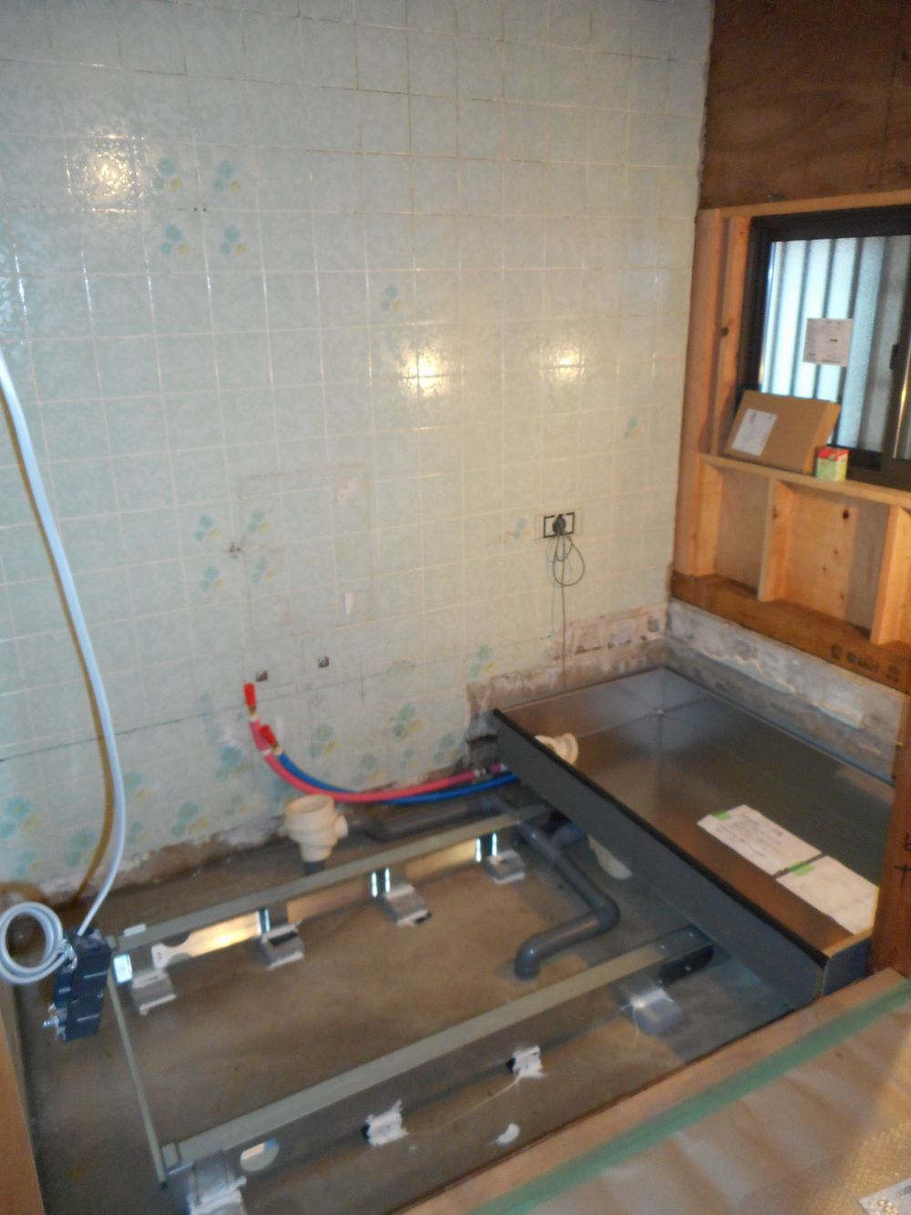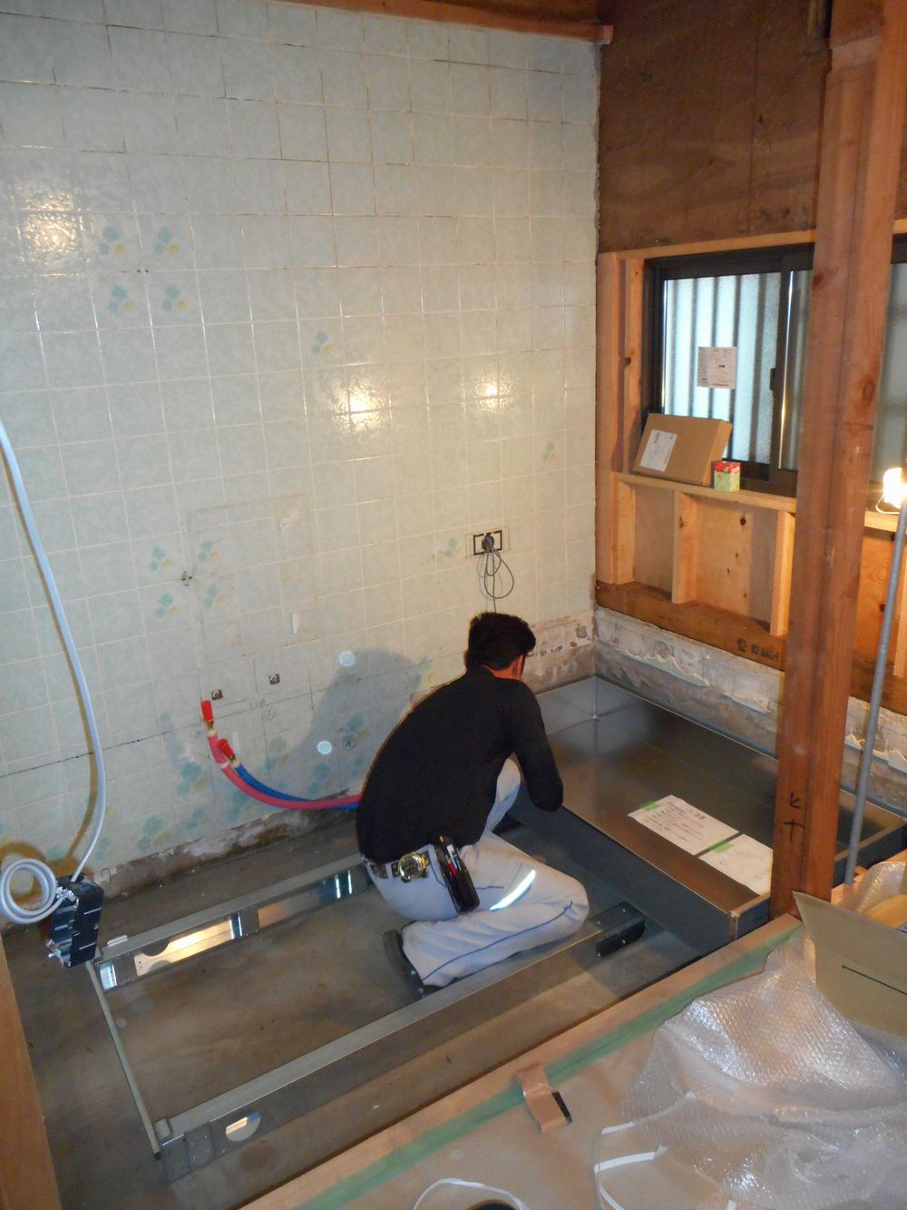 | 最初にシステムバスの基礎となる、架台の施工から始めます!! | 架台の施工が終わったら、浴槽の受け盤を組付けます!! |