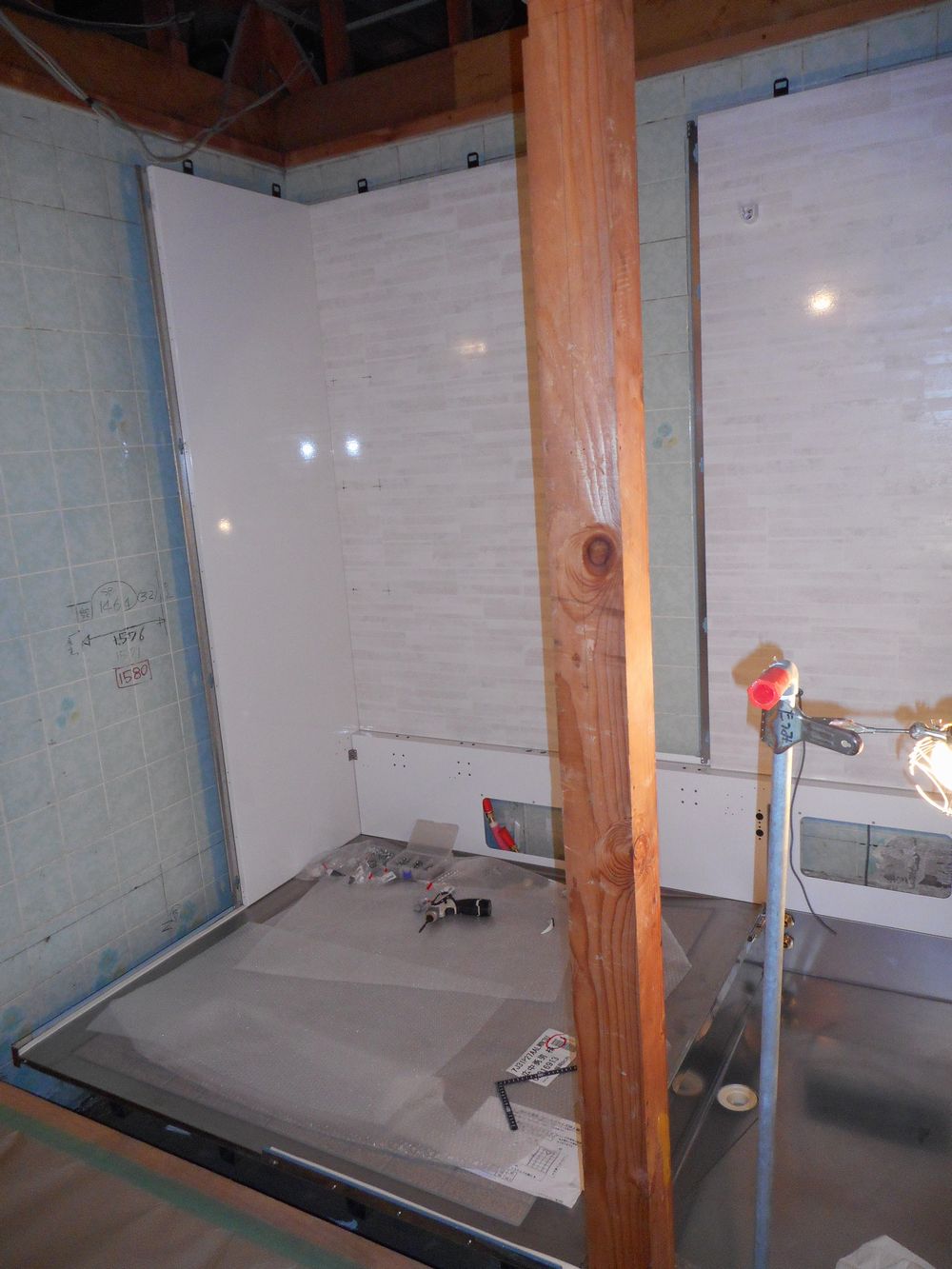 | 次に、洗い場となる部分を施工したら、前面パネルを組付けます!! | つづいて、側面パネルを順次組付けて行きます!! |