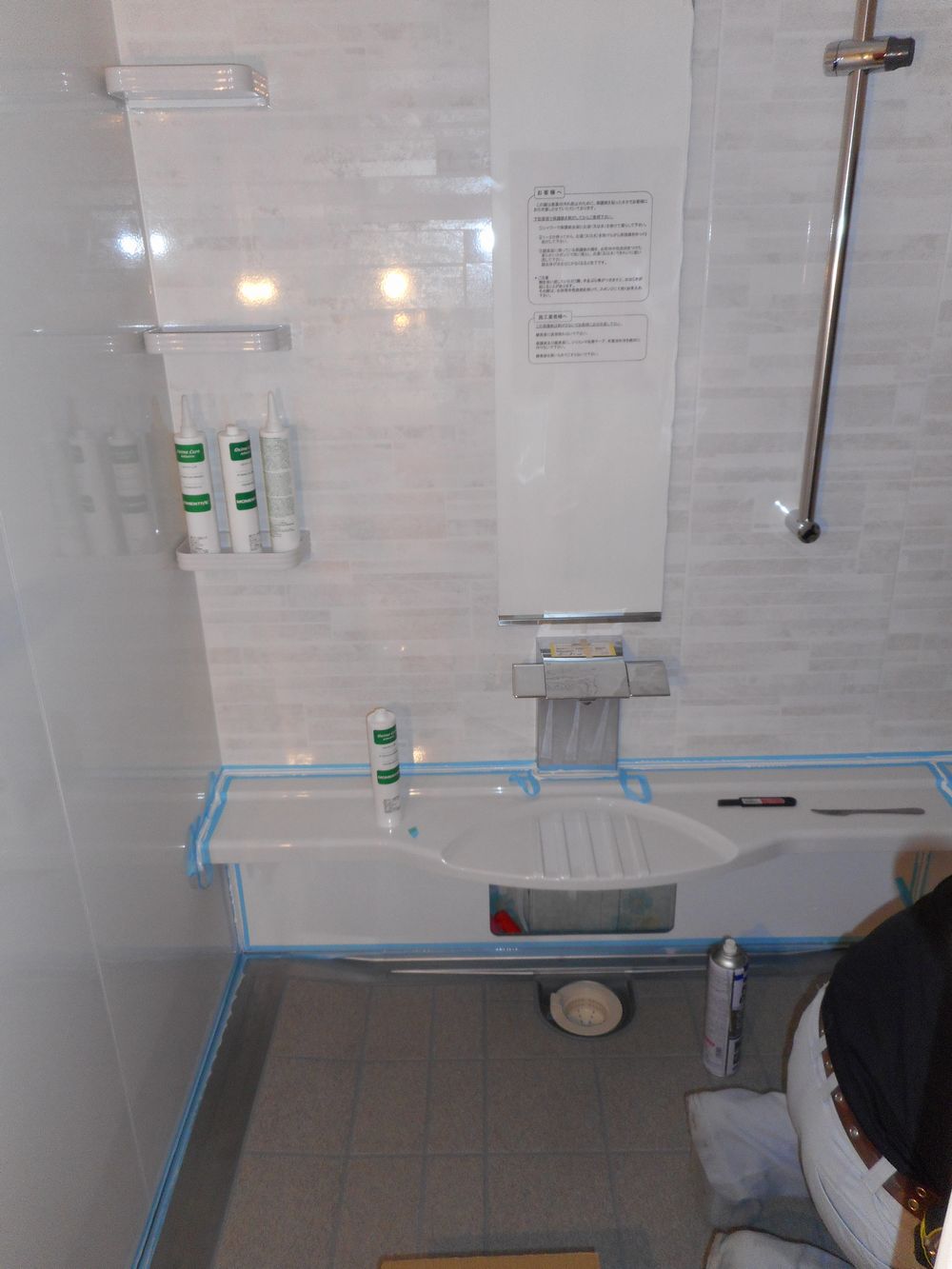 | コーキングを打ち、養生テープを撤去し完成です(入り口正面)!! | 浴槽廻りも、ご覧の様に完成しました!! |