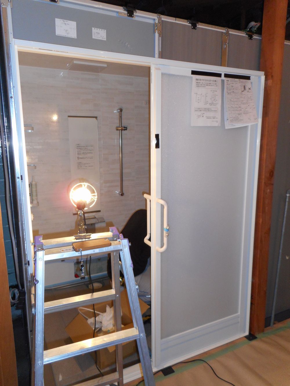 | 入り口の引き戸も取付けました!! | カウンター、鏡、シャワー水栓、収納棚を組付け、仕上げのコーキングを打つ養生テープを張りました!! |