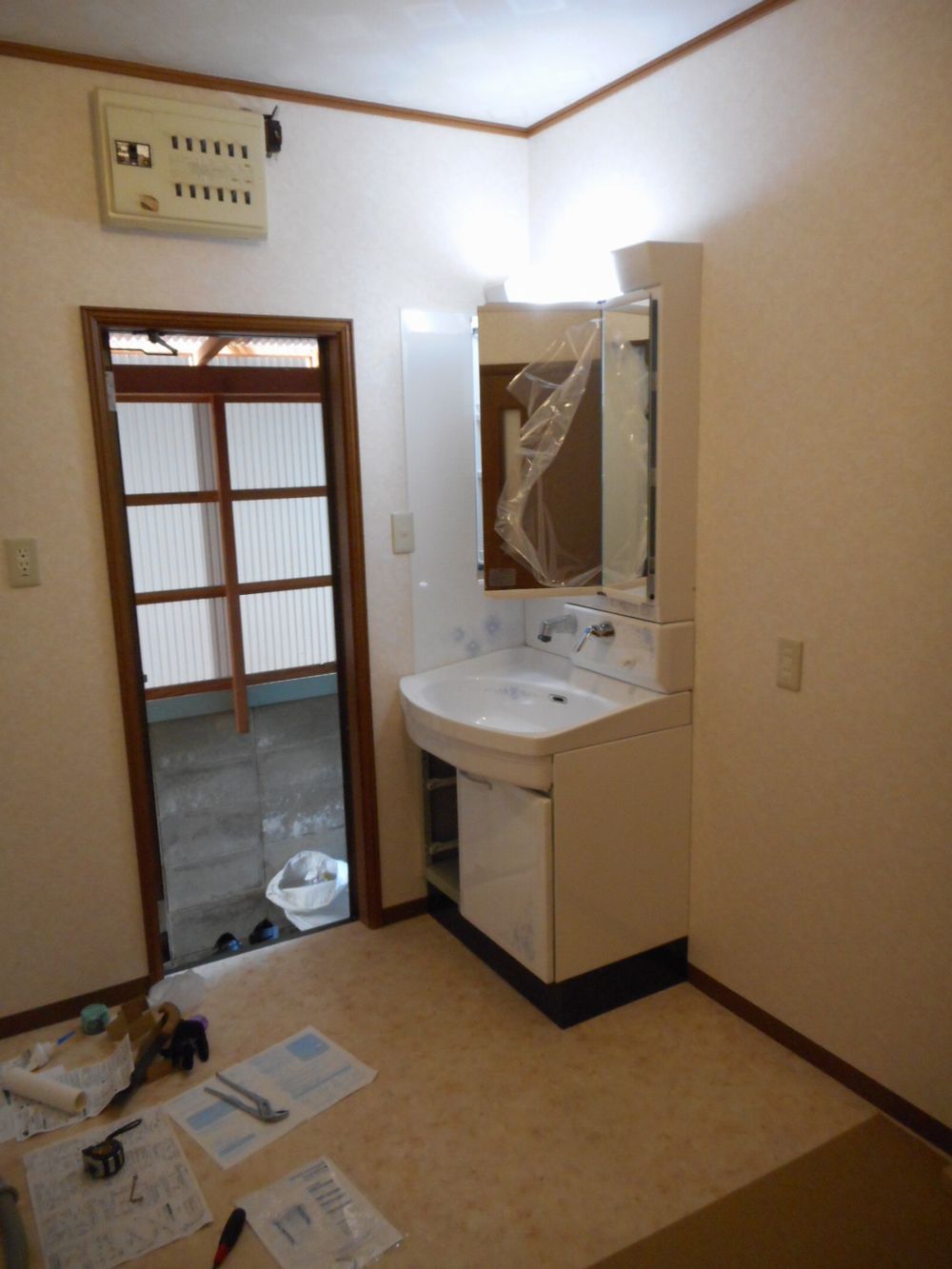 | 天井と壁廻りはクロスを、床にはCFを張り内装の完了です!! | 新規の洗面化粧台を設置しました!! |
