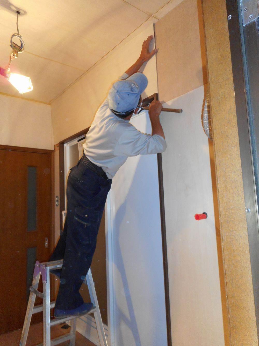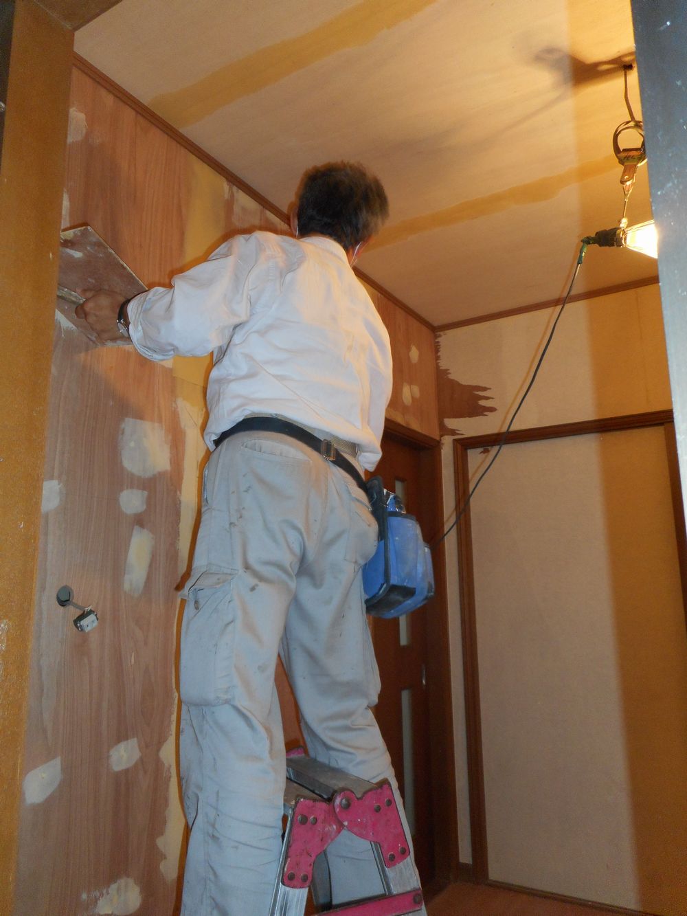 | 壁廻りにクロス下地のベニヤを施工します!! | クロスを張る前にパテ処理をします!! |