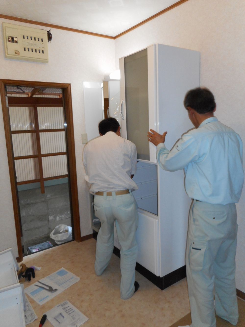 | 収納棚も新しくします!! | 新規の洗面化粧台と収納棚の設置が完了しました!! |