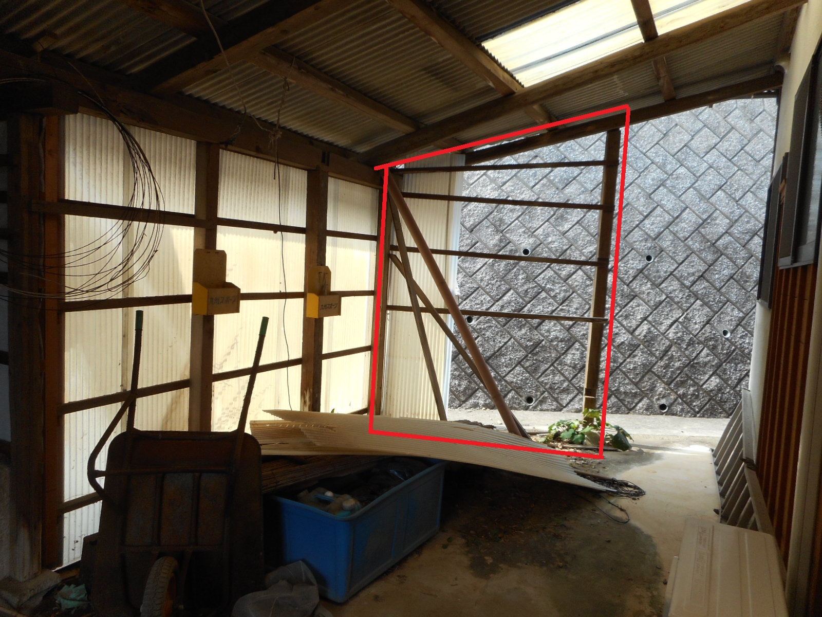 | 赤線で囲った部分の波板が飛びました!! | 外から見る(波板は全部張替えることにしました)!! |