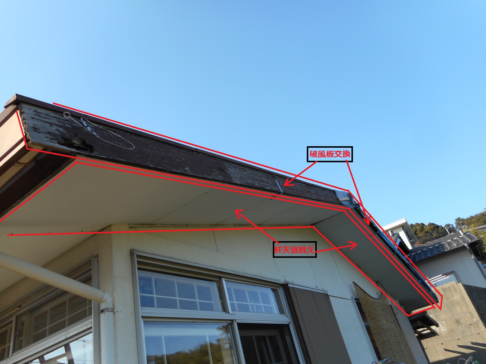 全体的に屋根の状態は悪いのですが、近い将来建て替えを考えているので、今回は赤線で囲った部分の屋根の修理と破風板と軒天の補修工事をすることになりました。