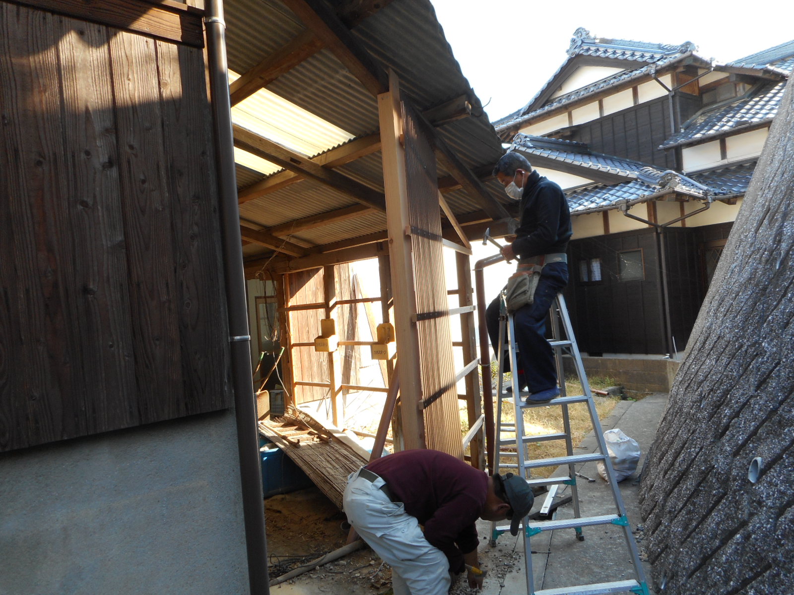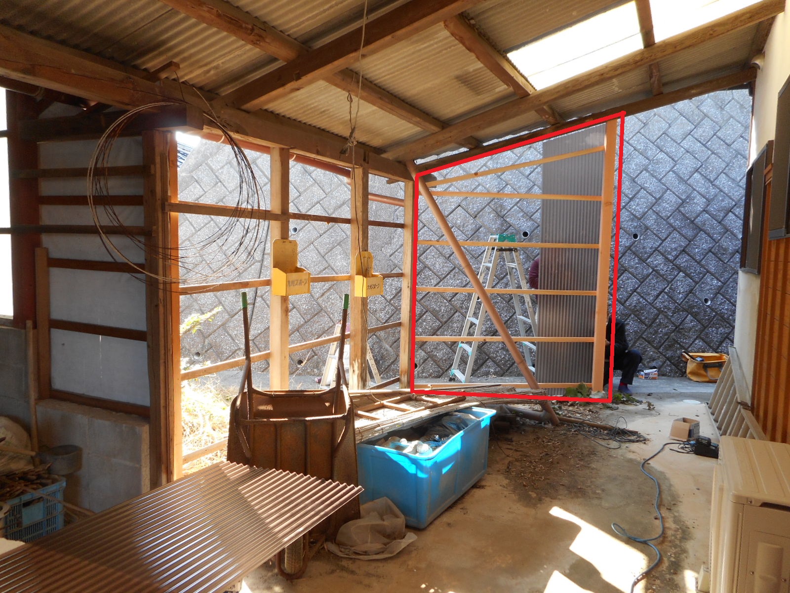 | 赤線の部分は柱と横の胴ブチを新しくし波板を張っています!! | 作業の様子を外から見る!! |