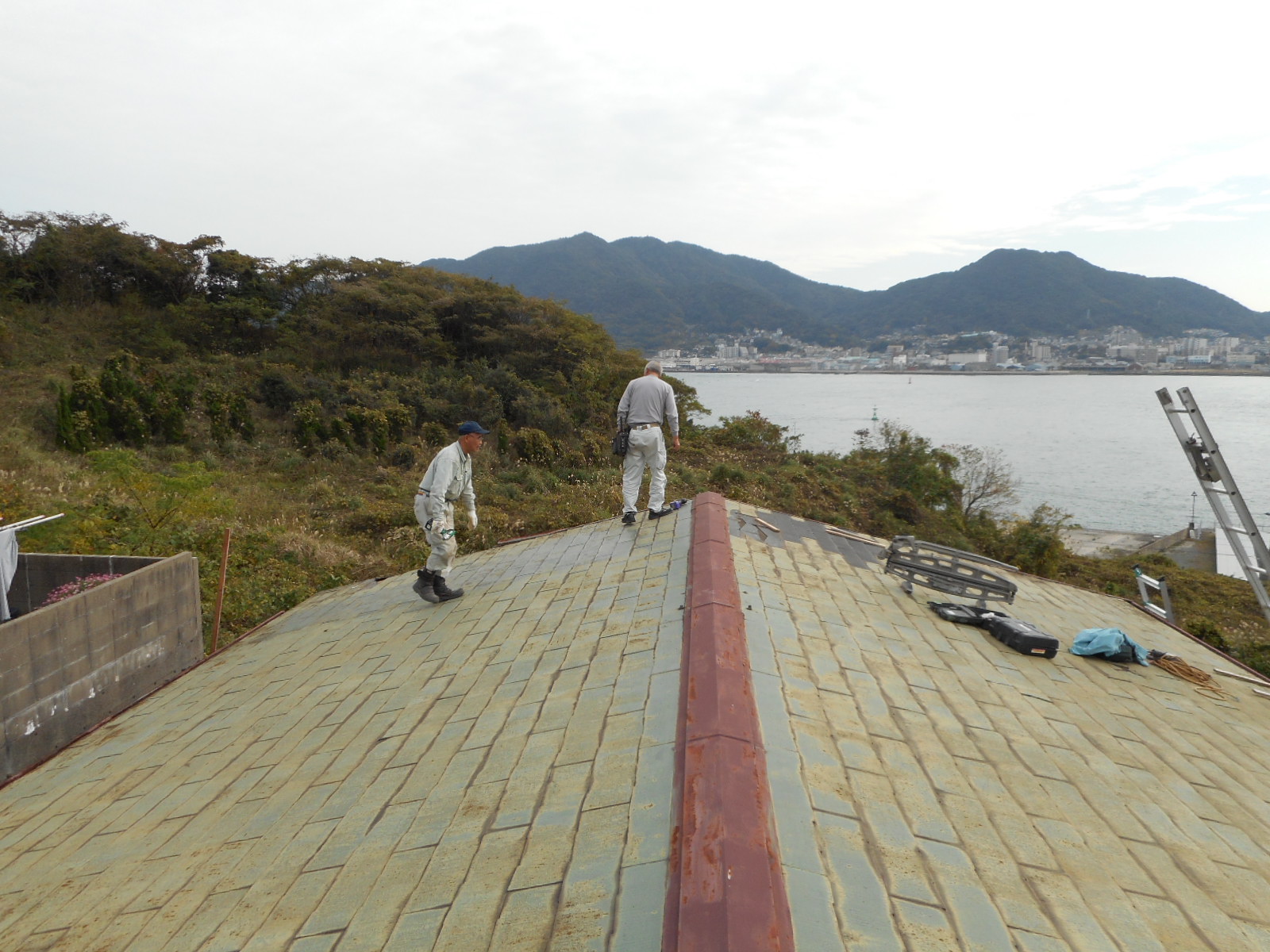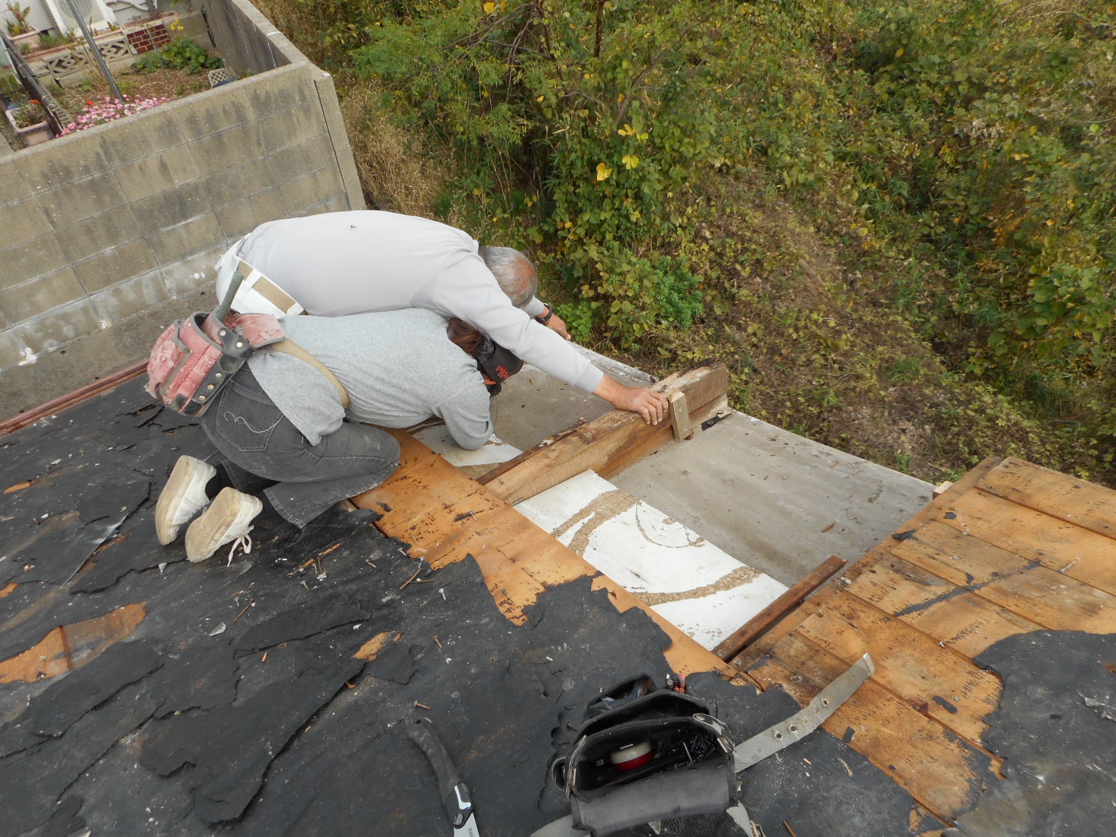 | 既存のコロニアル瓦を撤去して見ると、下地のバシ板の一部は完全の腐ってダメな状態でした!! | 母屋も状態が悪いために、補修が大変でした!! |