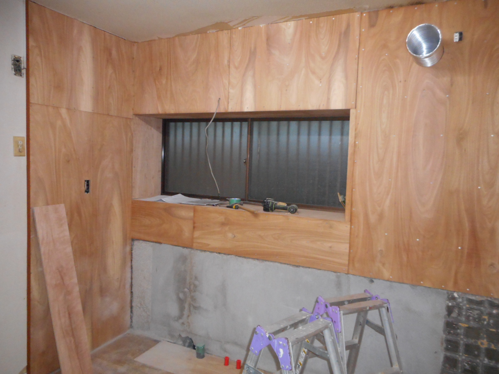 | キッチンパネルを張るための、下地コンパネを施工します!! | 下地づくりが完了しました!! |