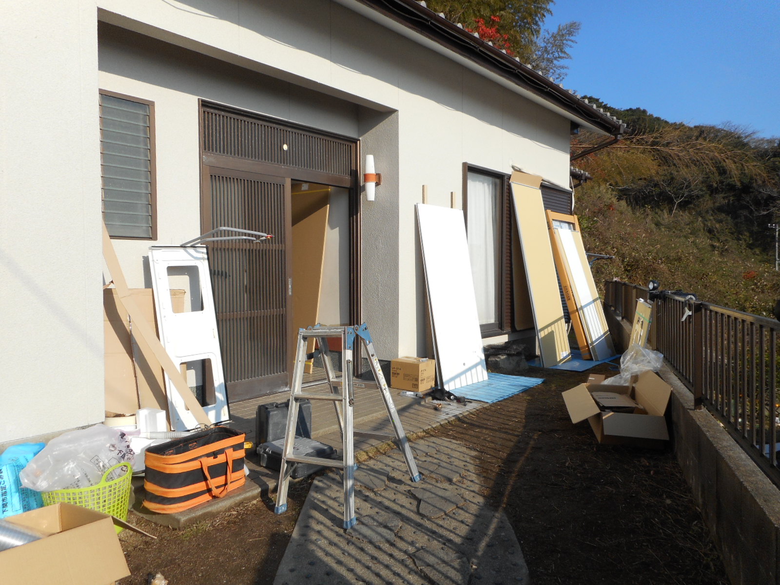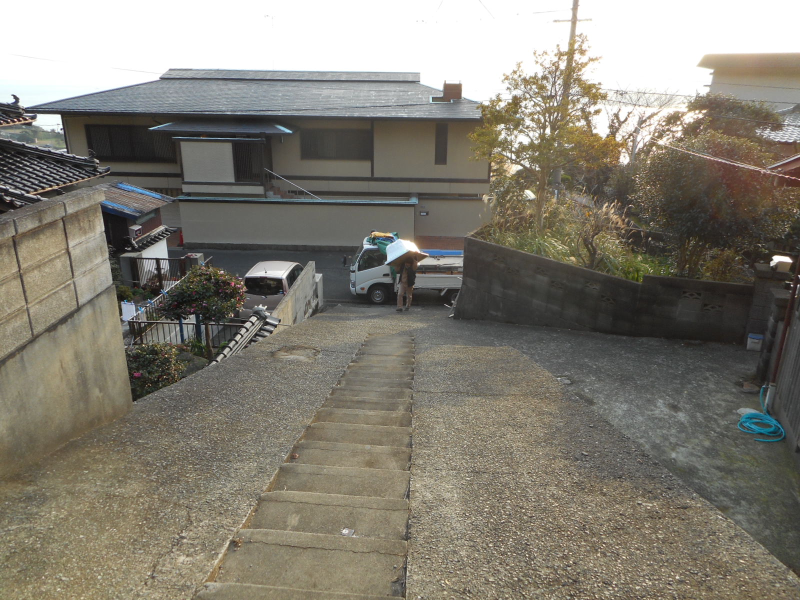 | 車が上まで上がらないため、各部材を下から運びます!! | 部材を順次運び入れて、外に置きます!! |