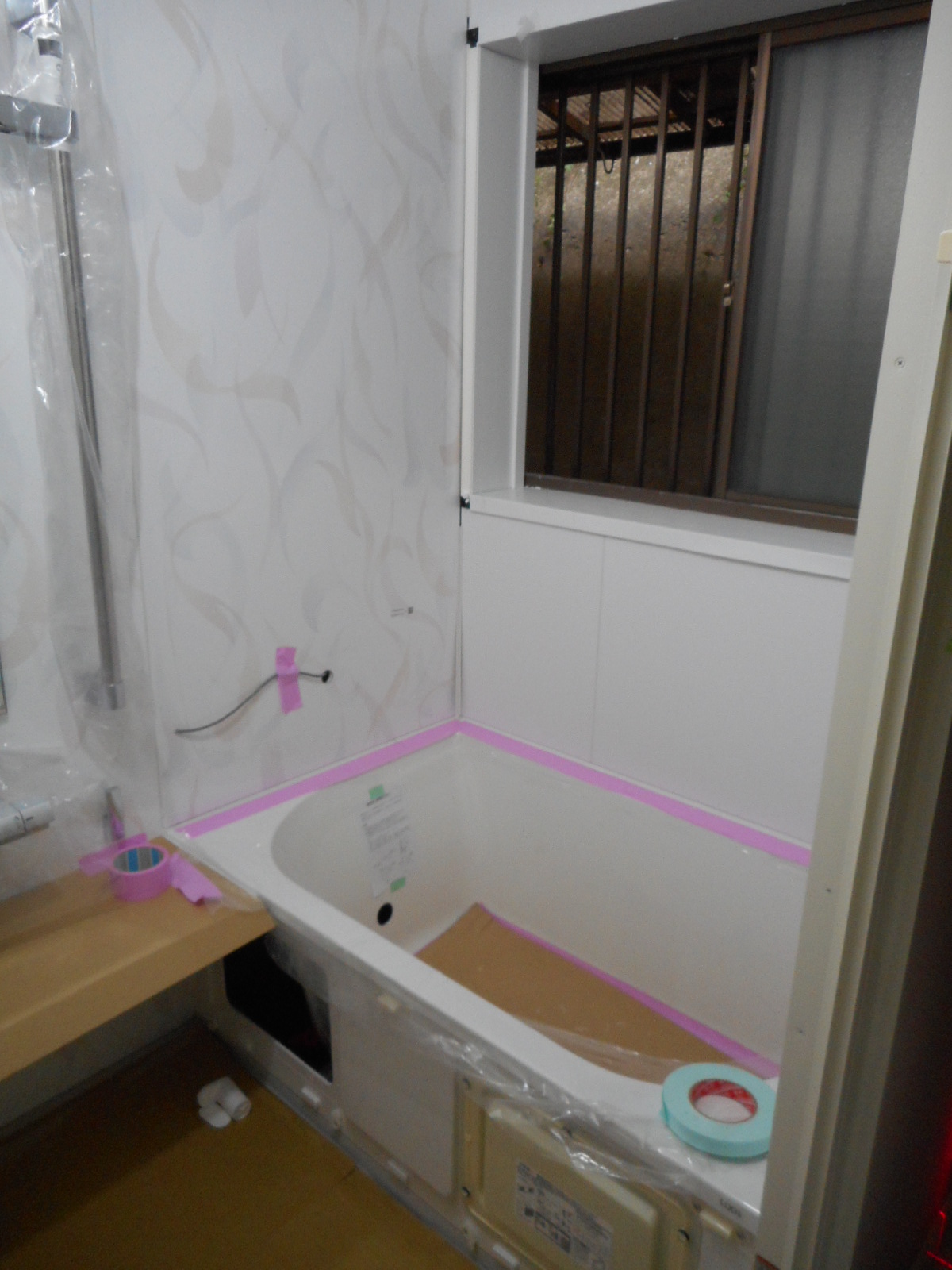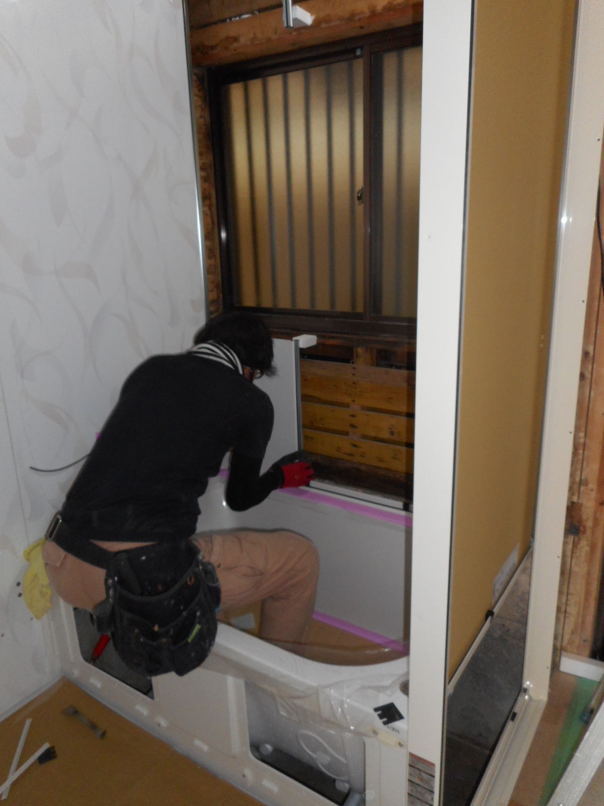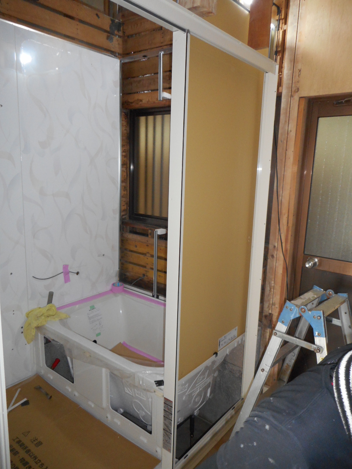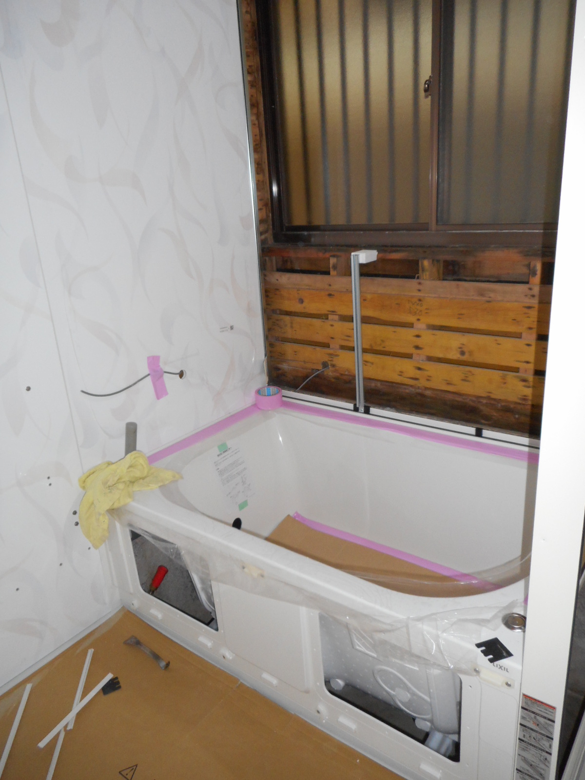 | 最初に洗い場を据付け、排水管を接続します!! | 前面の壁パネルを組付け、浴槽を据付けました!! |