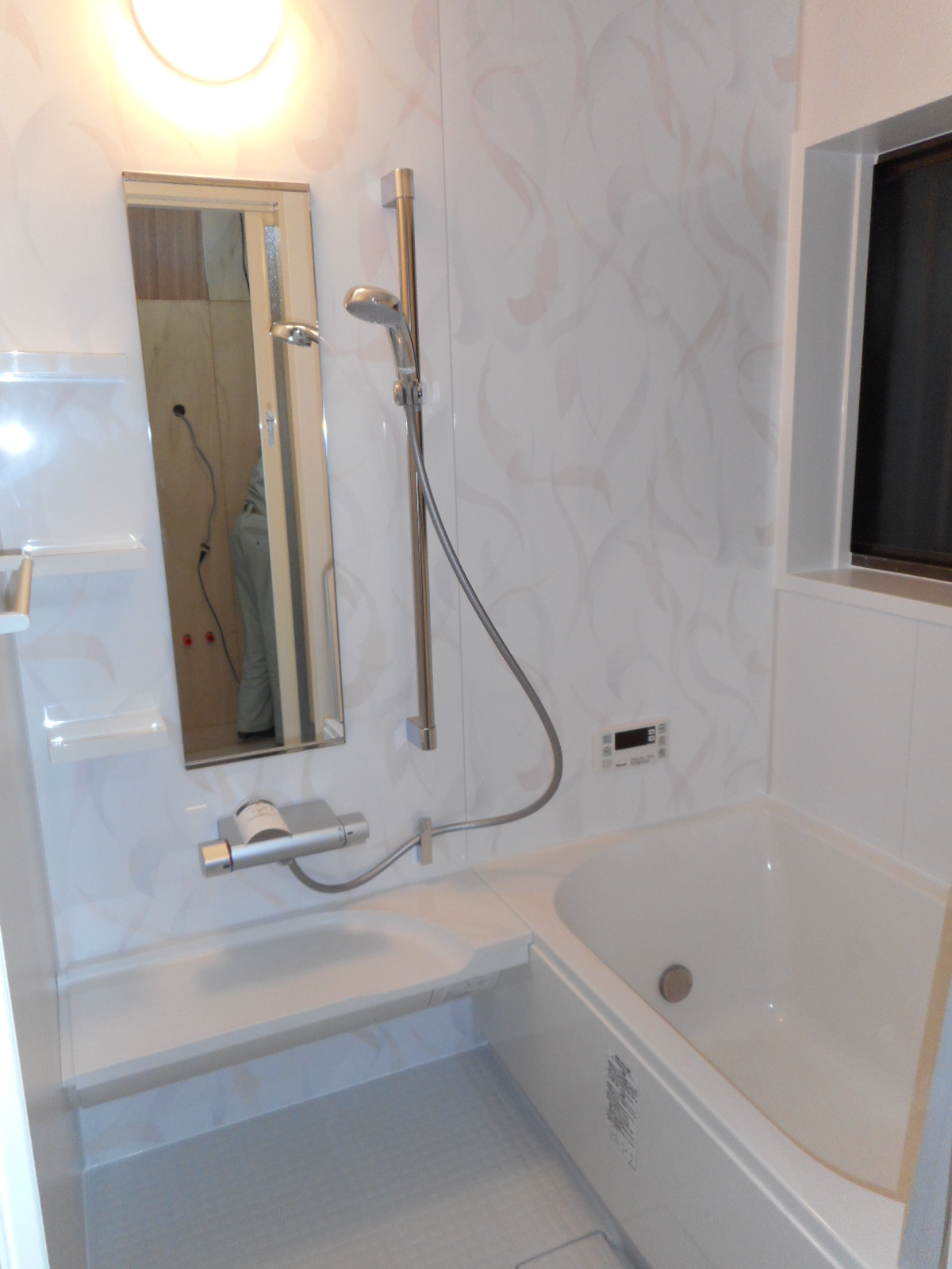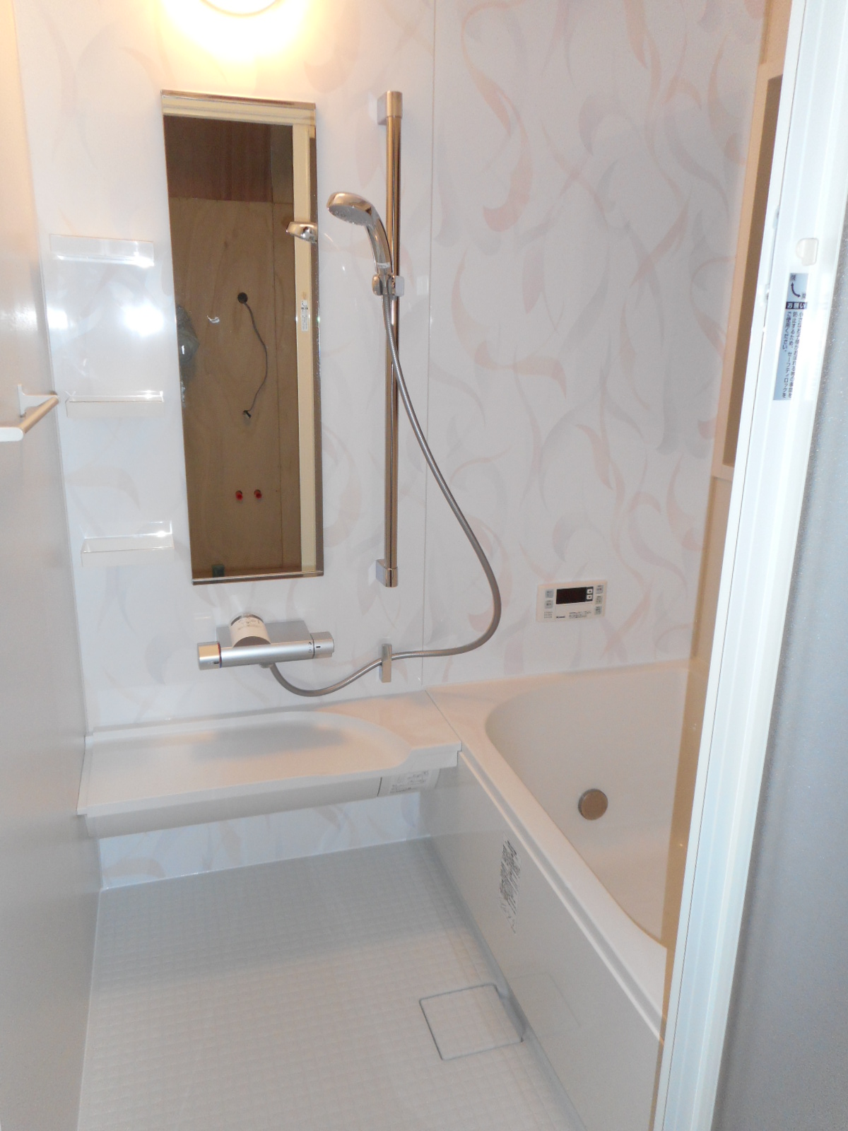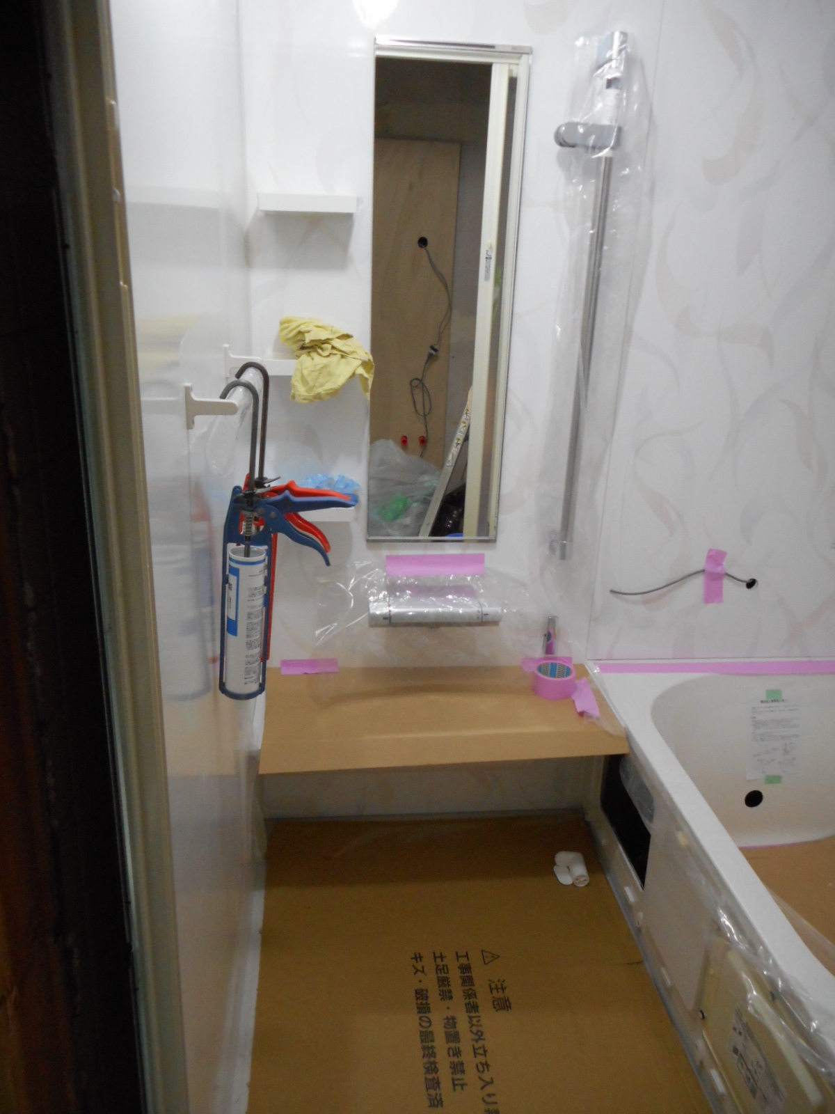 | 側面パネルの組付けが完了しました!! | 洗い場の正面に、カウンター、鏡、水栓、棚、タオル掛け等の備品も取付けました!! |