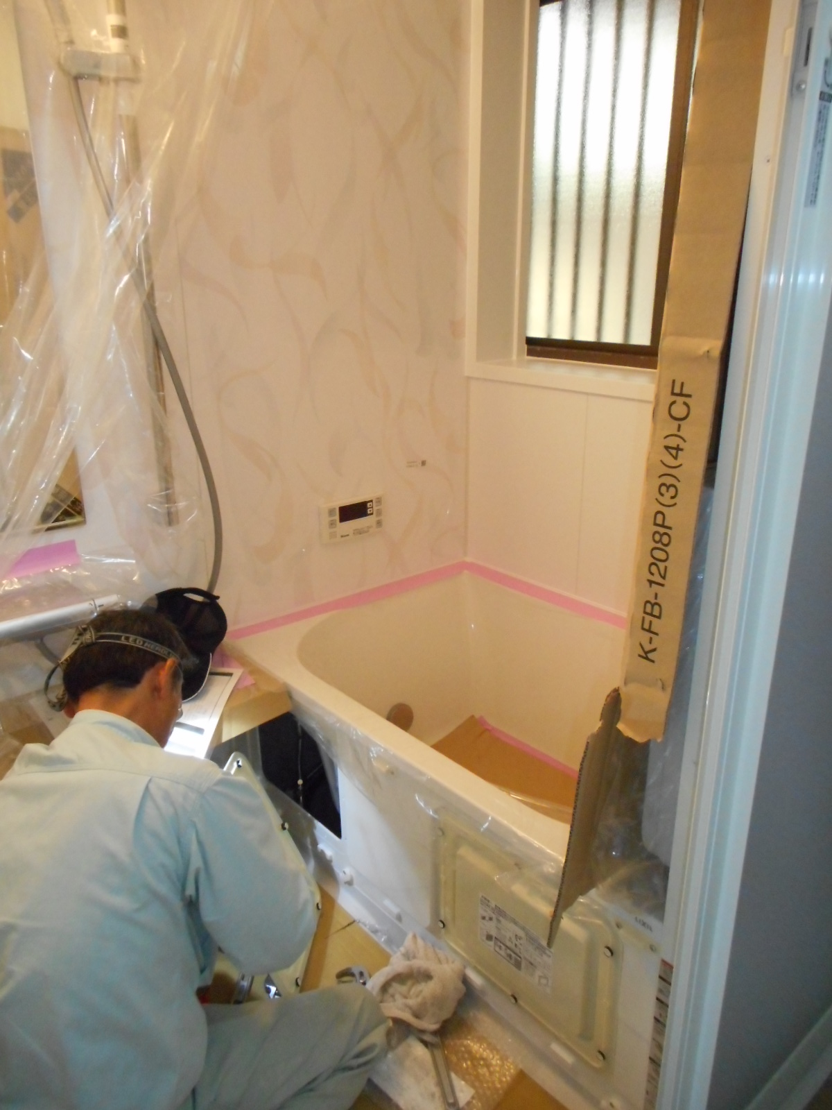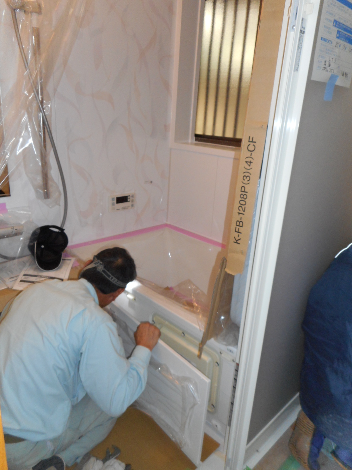| 最後に設備屋さんが、各管の接続作業をします!! | 接続が終わったら、浴槽のエプロンパネルを取付けます!! |