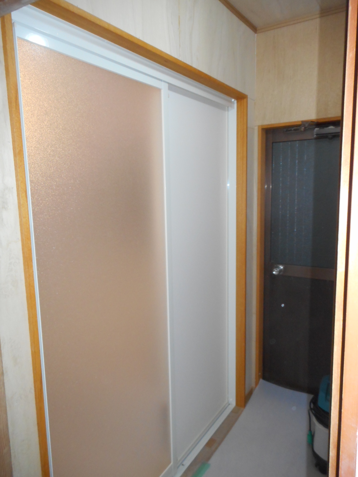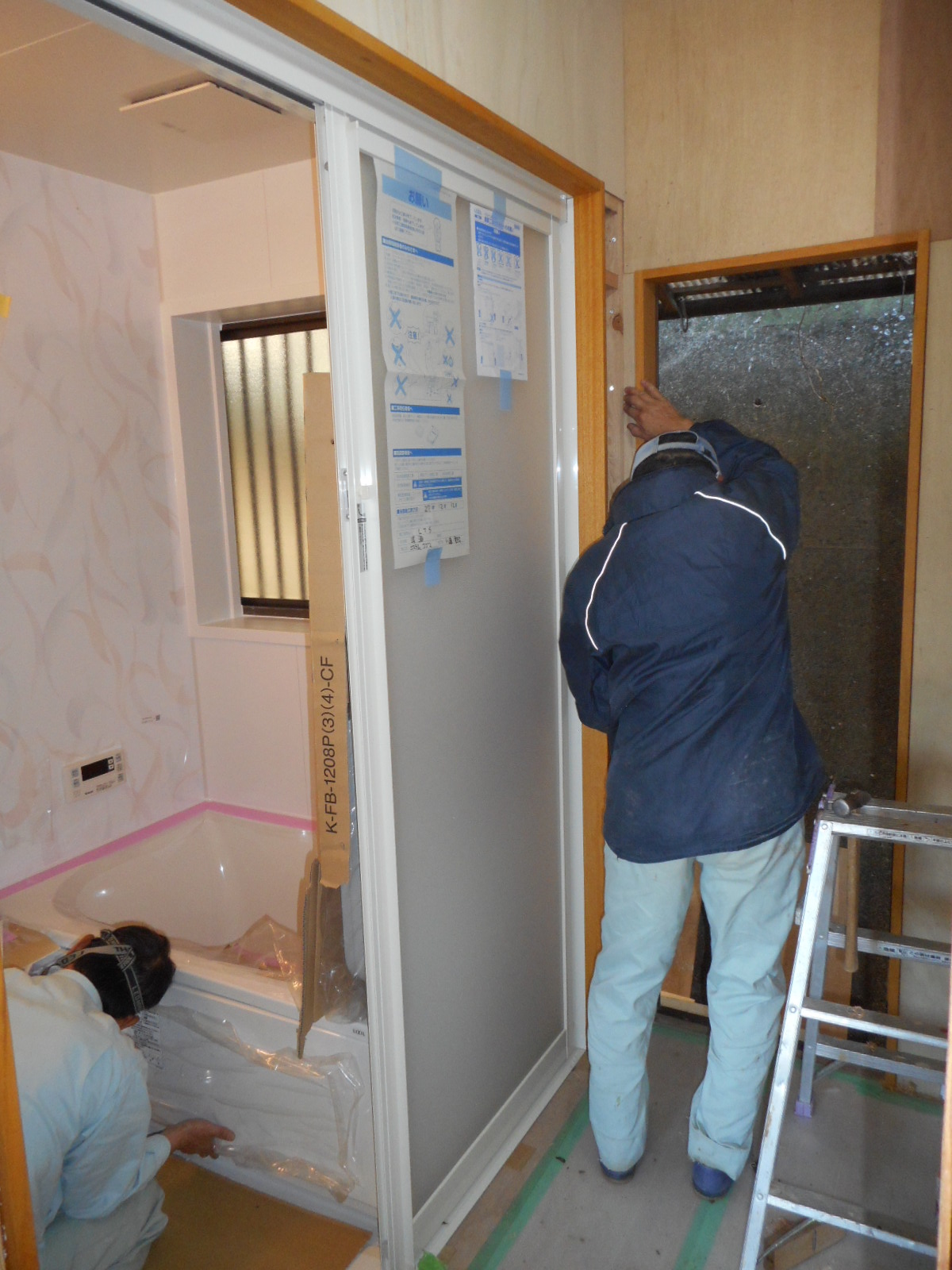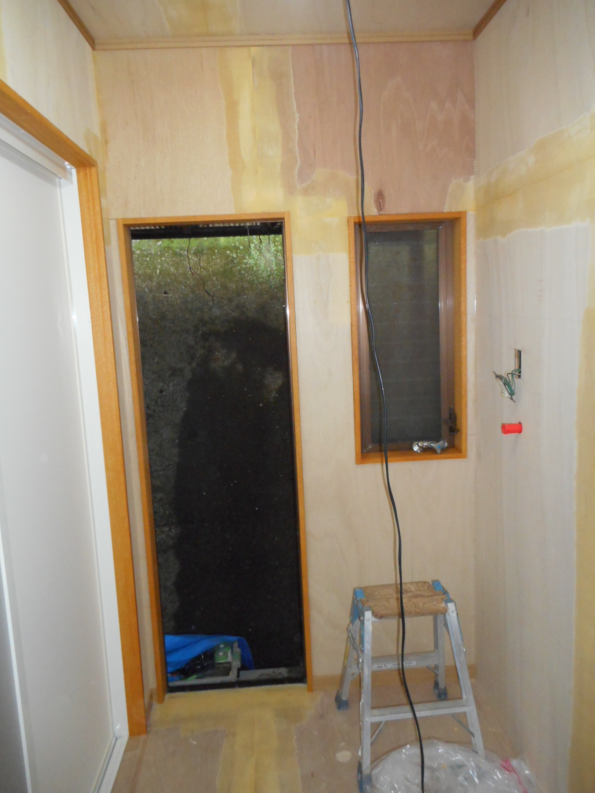 | システムバスの組立て後、浴室の入り口廻りに化粧枠を施工します!! | クロス下地のベニヤの施工も完了しました!! |