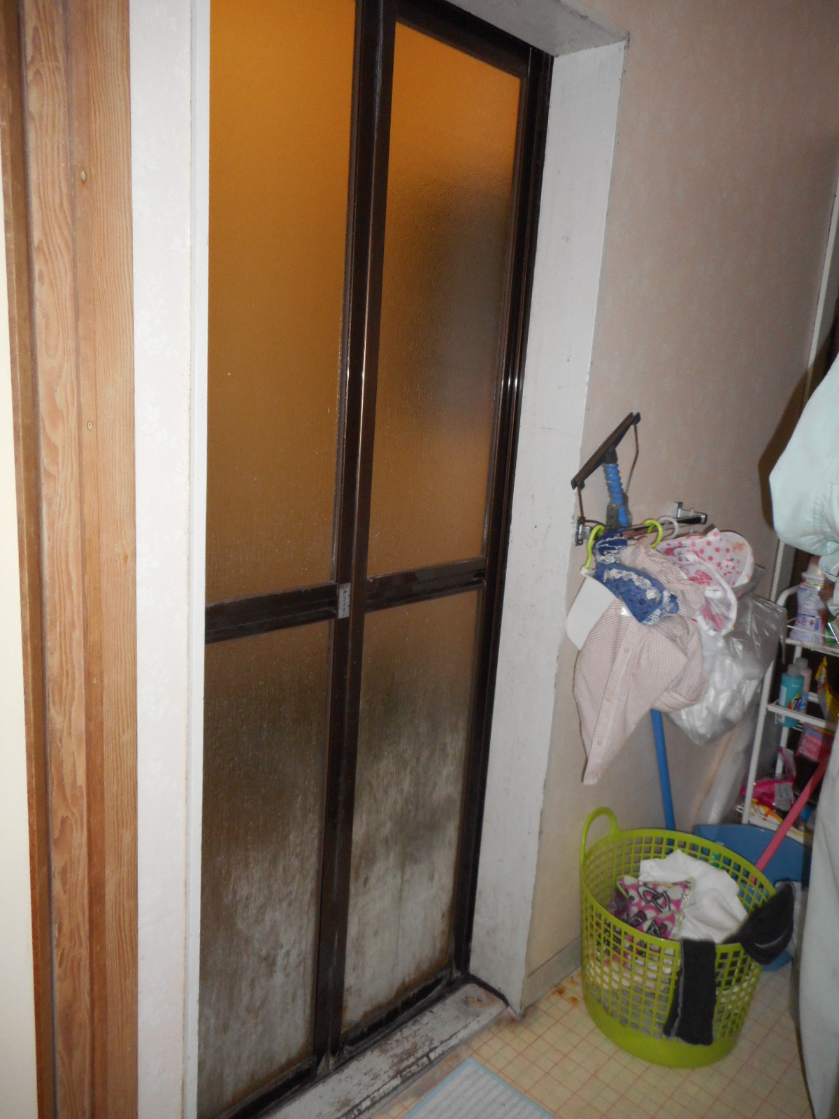 | 工事前の浴室側です!! → | 浴室側の壁を撤去し、床も解体後根太を新しくしました!! |