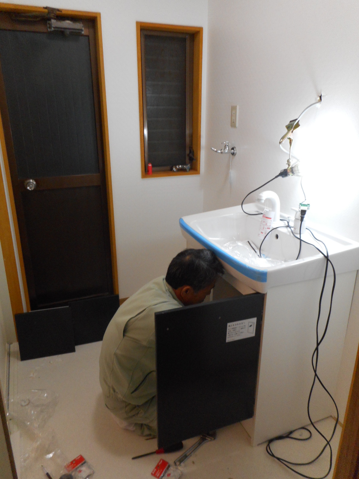 | 浴室側のクロス張りも完了です!! | 設備屋さんが新規の化粧台を取付けます!! |