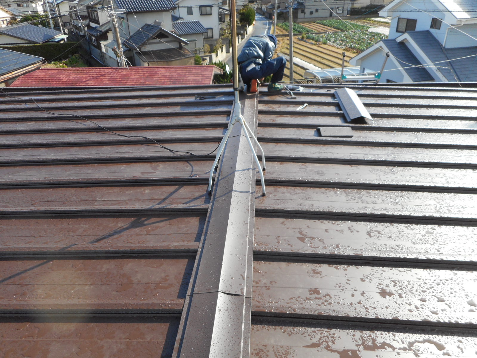 | 瓦棒の施工が終わった部分の、瓦棒の合せ目に押さえ金物を取付け固定して行きます!! | 棟の部分に、棟板金を施工する時に必要な下地金物を施工して行きます!! |
