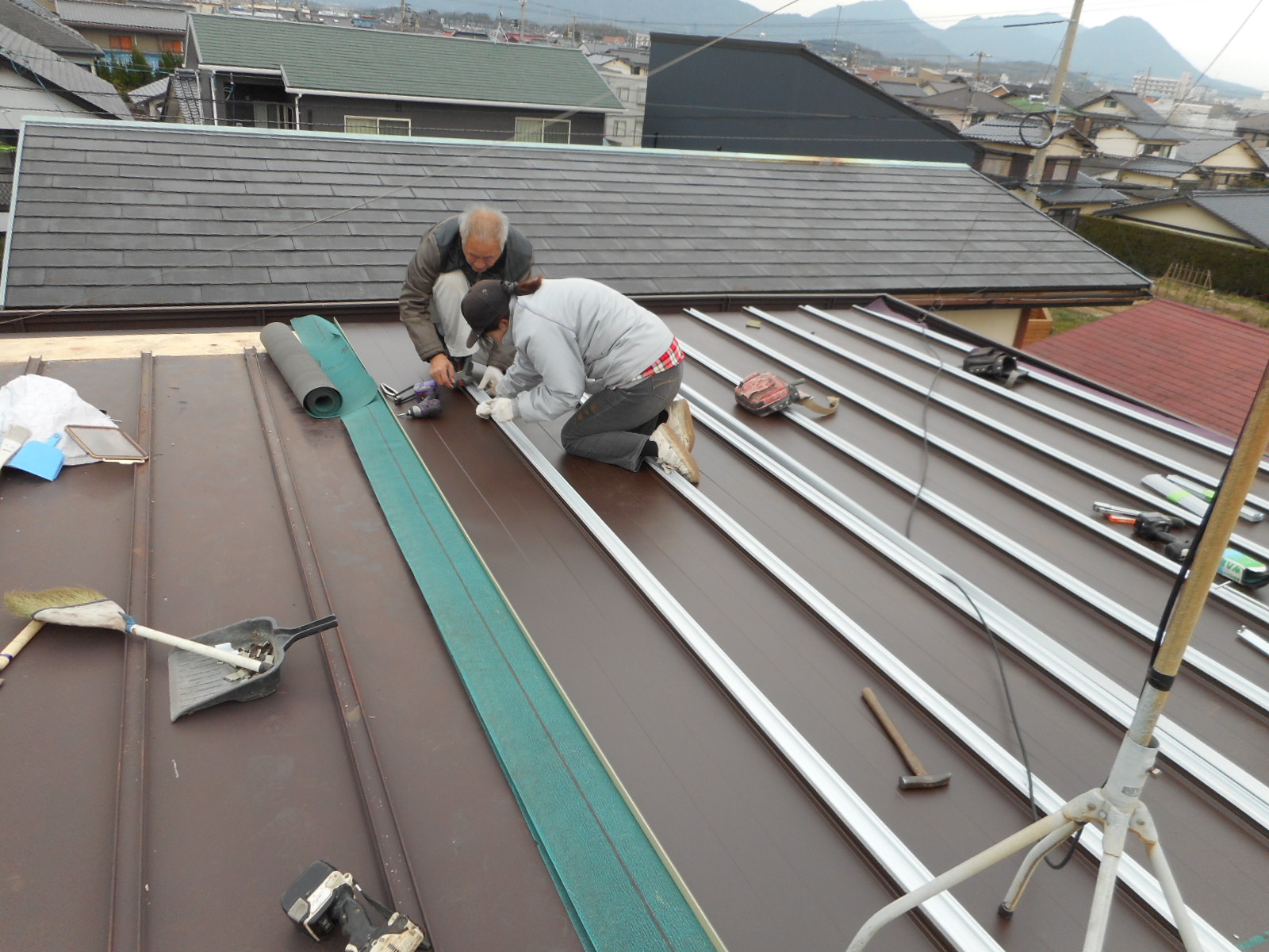 | 屋根の先端に、唐草の取付けからスタートします(新規の瓦棒を施工し、最後に巻き込む時に必要な部材です)!! | 既存の瓦棒の上にアスファルト/ルーフィングを敷き、その上に新規の瓦棒を施工して行きます!! |