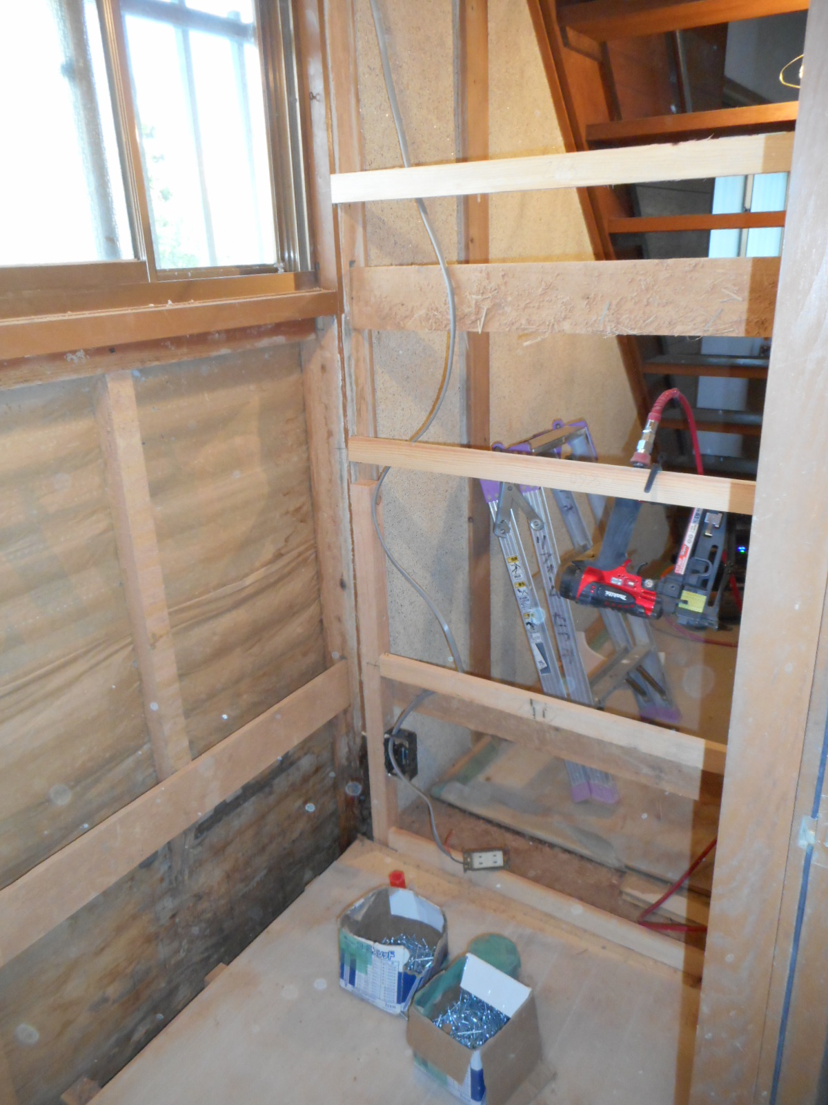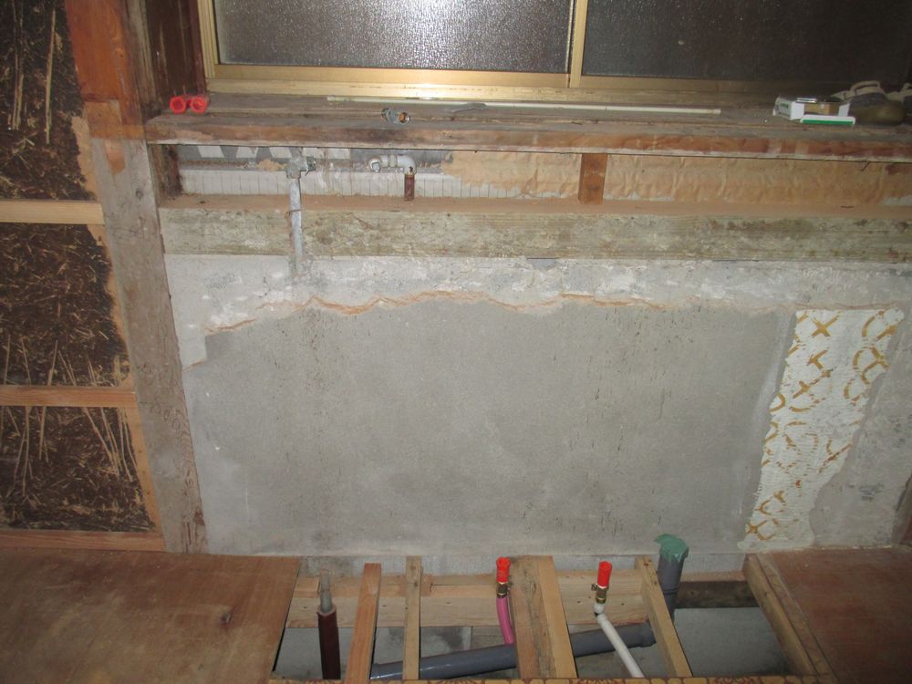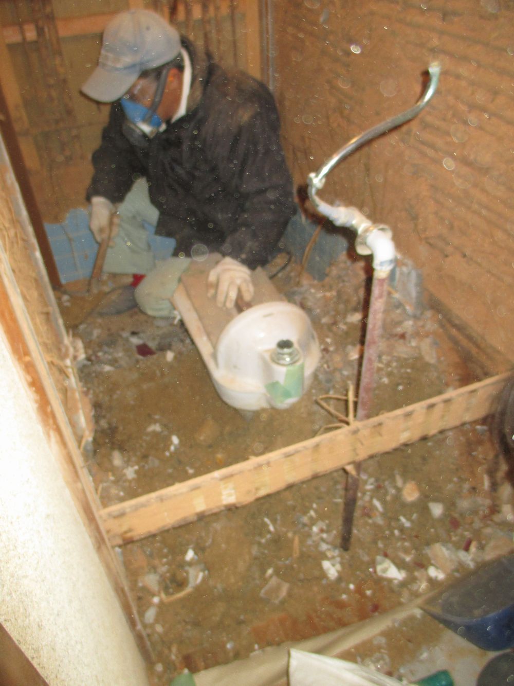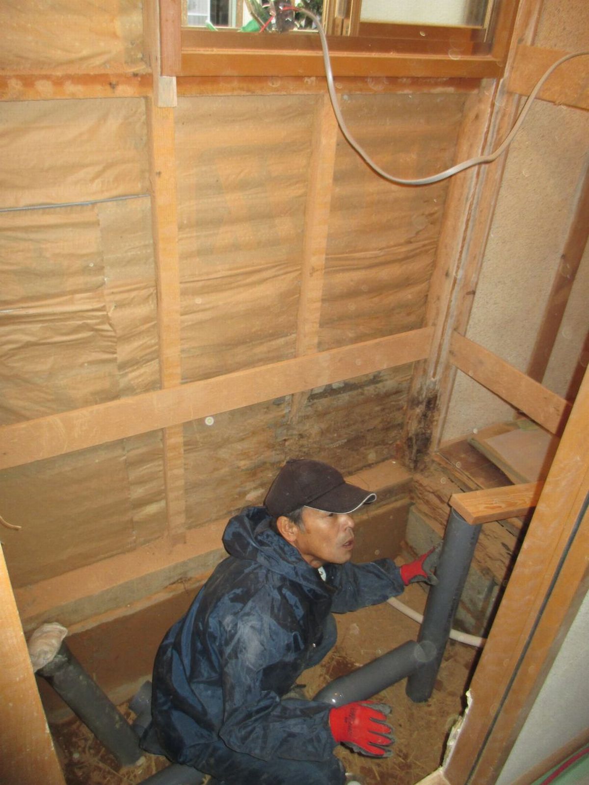 | 解体作業の後、設備屋さんが給排水管の移設工事をします!! | つづいて内装の下地づくりを行います!! |