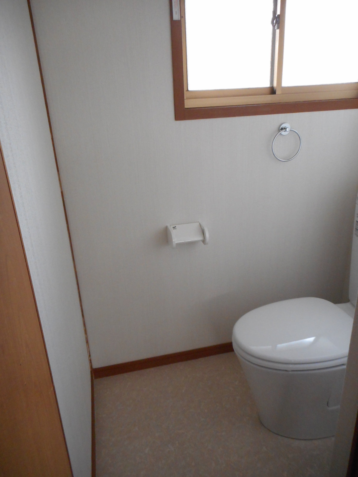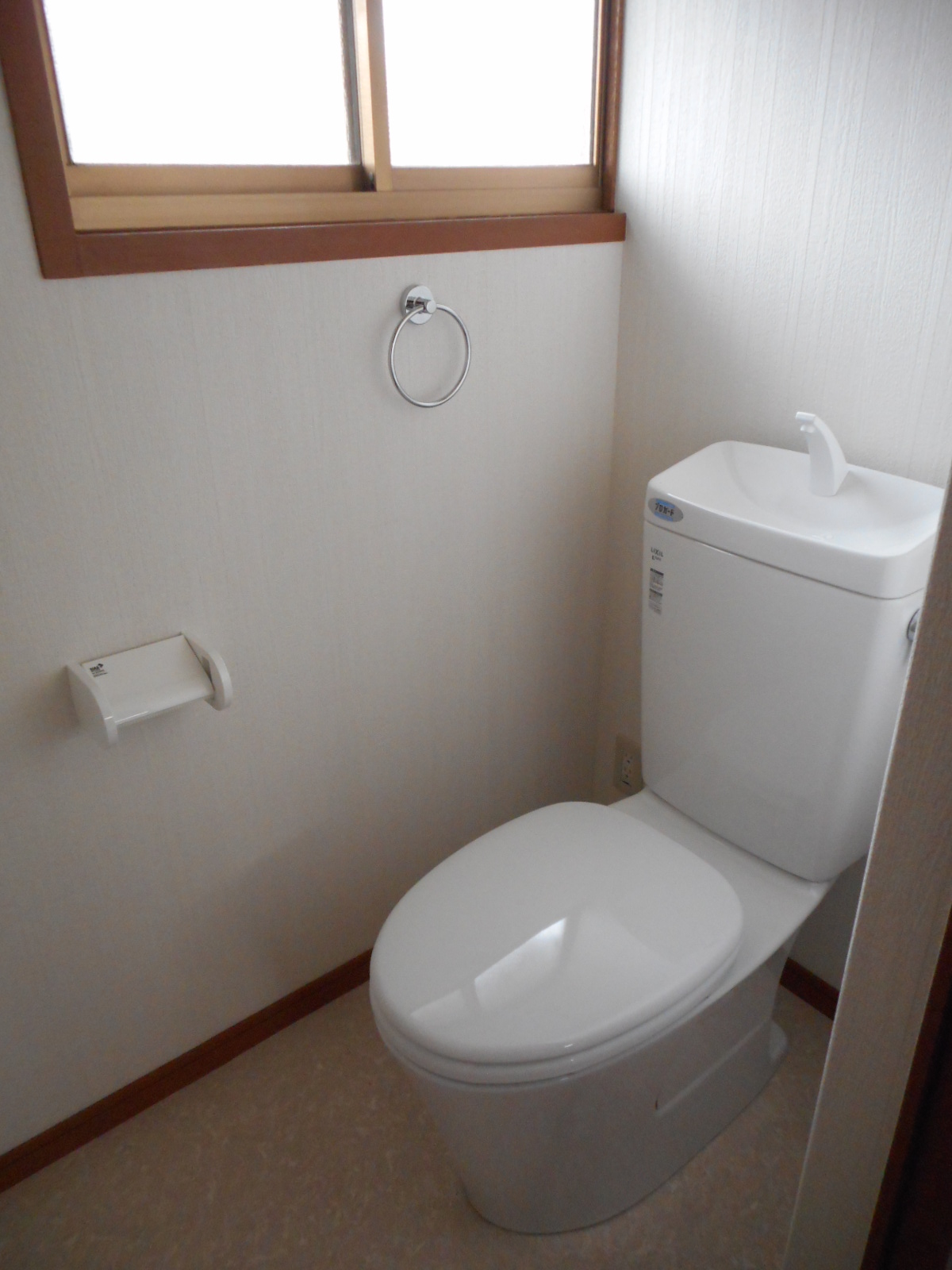 | 備品を取付け入り口側も、ご覧の様に仕上がりました!! | 奥も便器、タンクを組付け完成です!! |