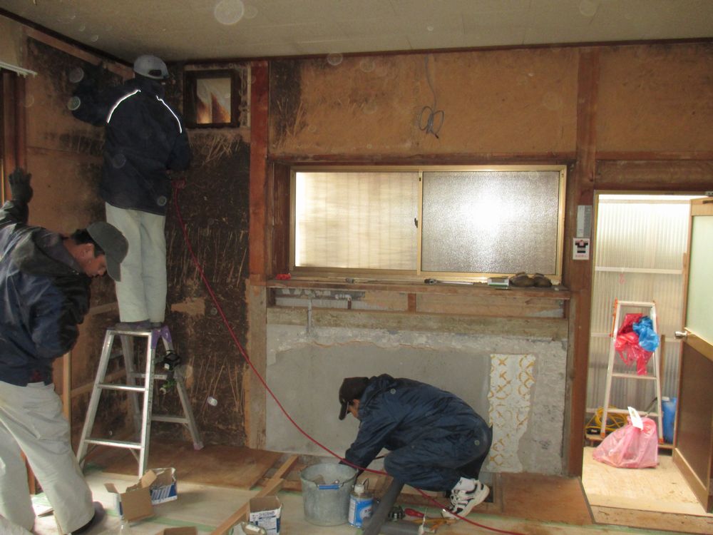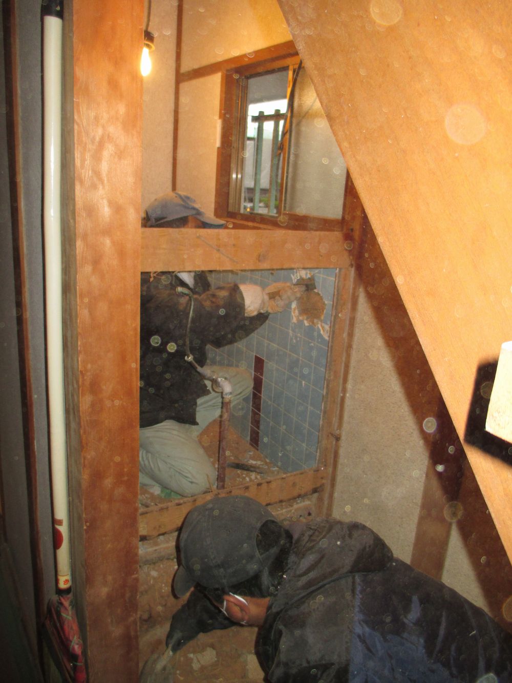 | 状態の悪い正面の壁(階段側)の壁も解体しました!! | 解体作業の様子を、壁を解体した階段側から見る!! |