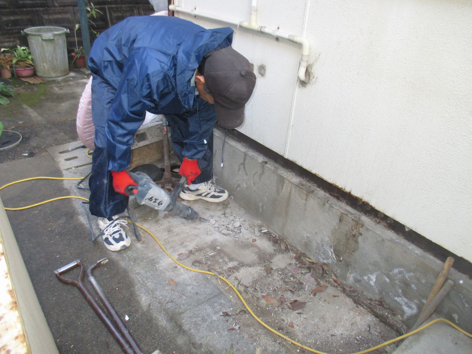 | 電気温水器を撤去し、新規のガス給湯器を設置します!! | 新規の配管を通すために、コンクリートをハツリます!! |