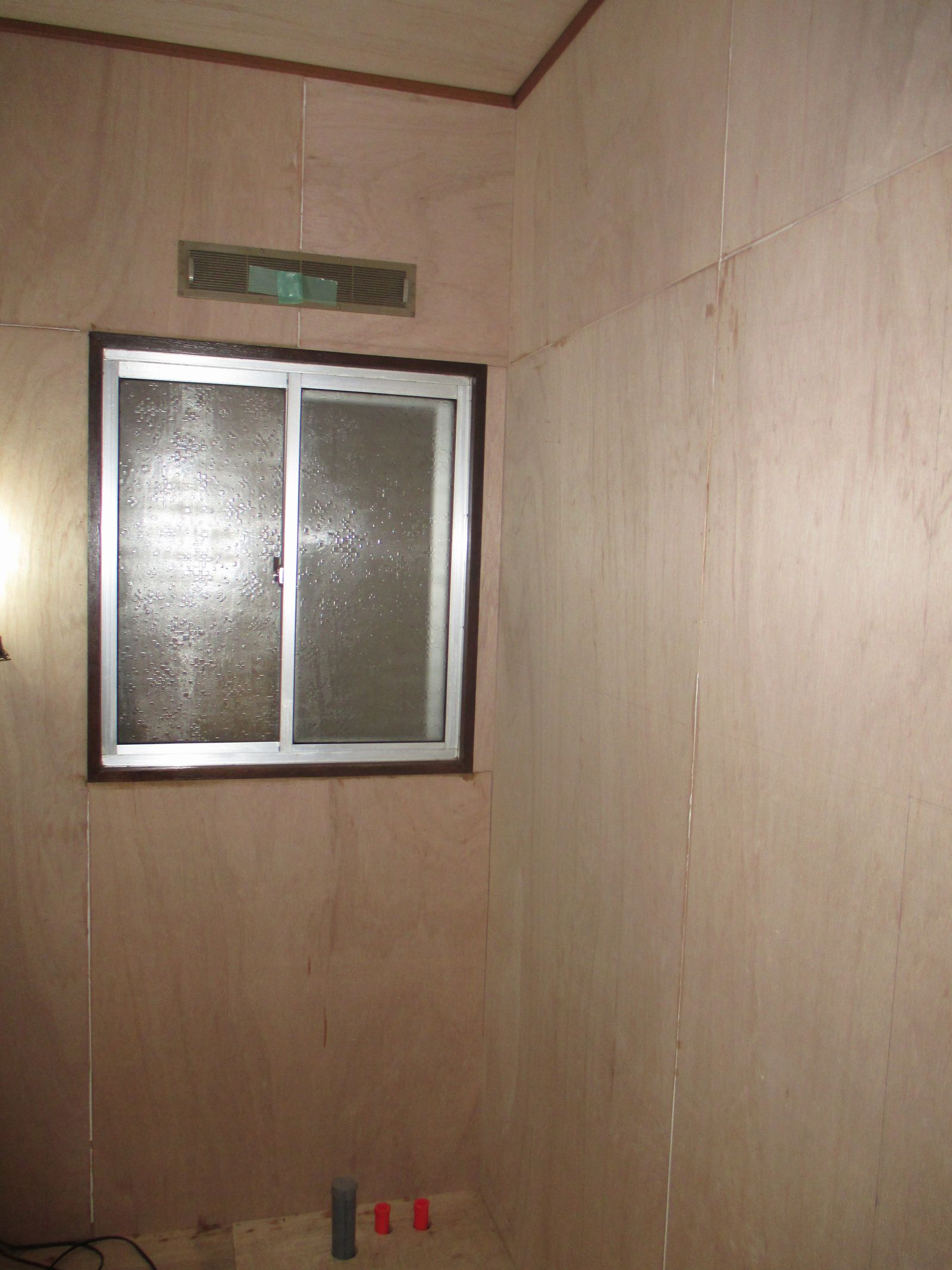 | システムバスの組立が終わったら、入り口の引き戸廻りに化粧枠を取付け、壁の下地づくりをしました!! | 新規化粧台の給排水管の移設,整備をし、内装の下地づくりも完了しました!! |