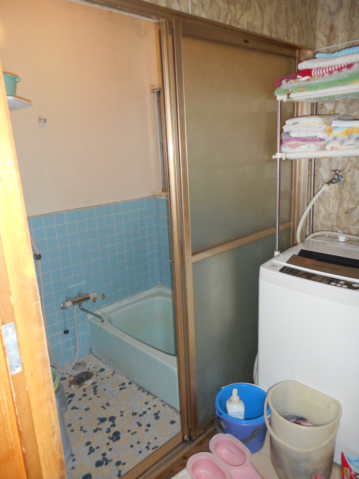 | 浴室側の壁を解体しました!! | 洗濯機を一時撤去し、化粧台(下台)も撤去しました!! |