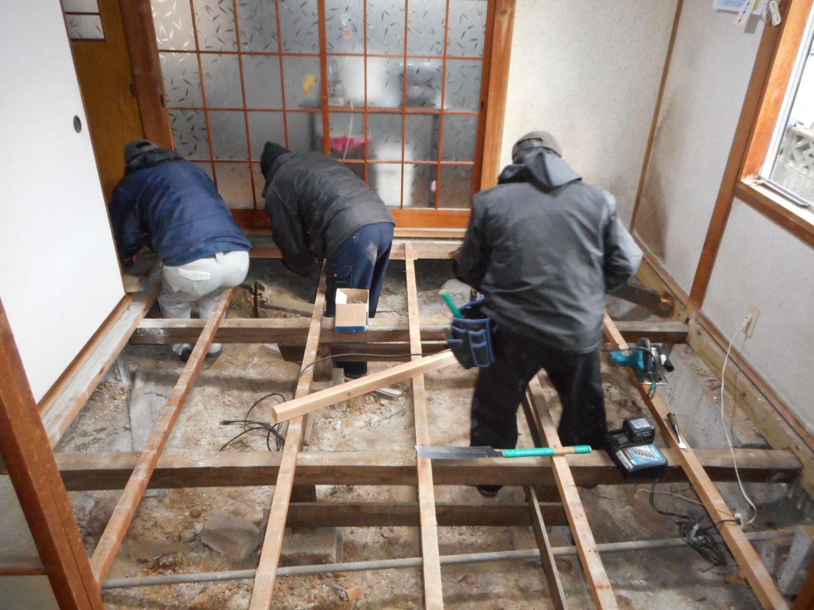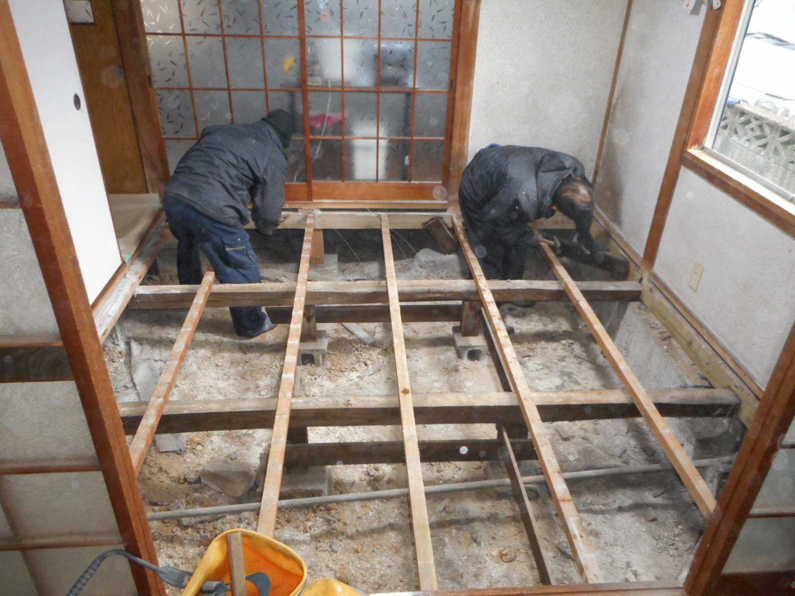 | ジュウタン、畳、座板を撤去しました!! | 根太にピッチが広いので、間に新規の根太を入れる作業します!! |