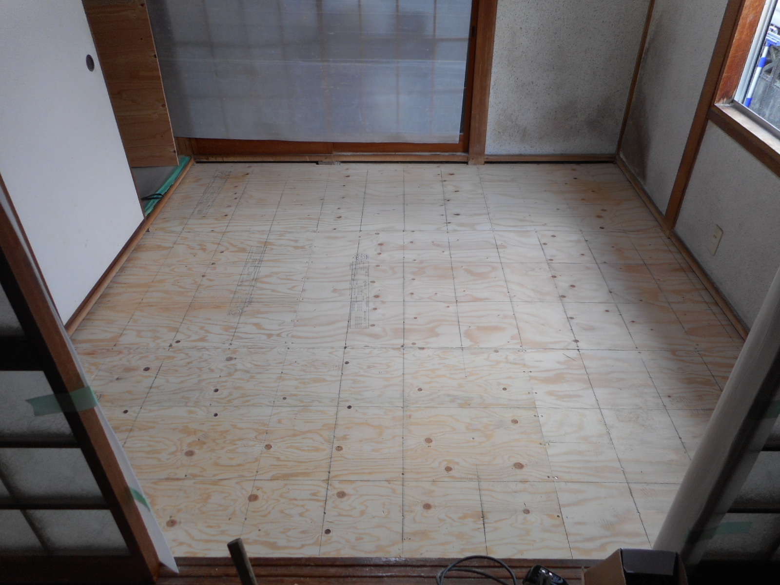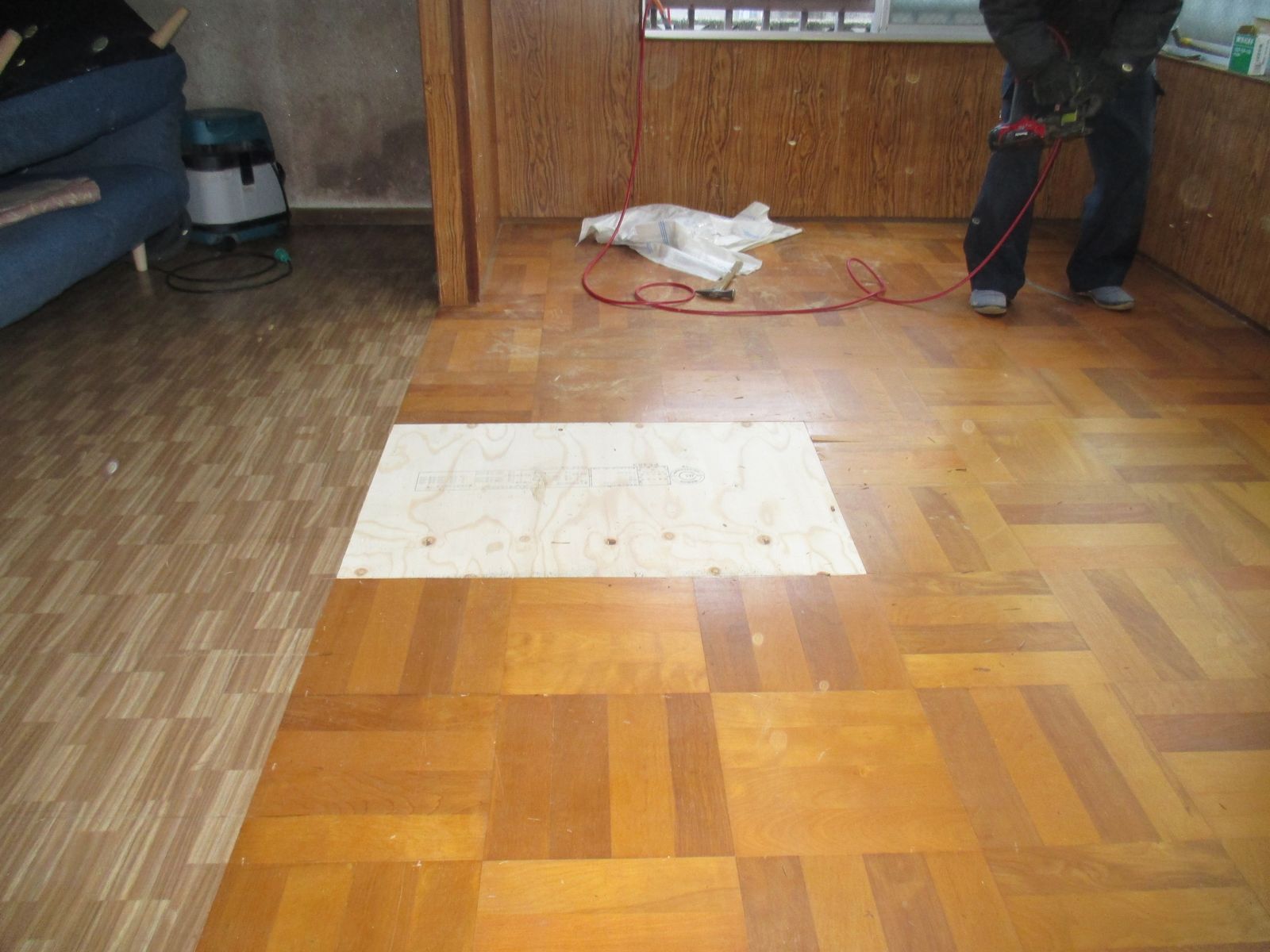 | ジュウタンを撤去し、ブカブカして状態の悪い部分を開口して撤去します!! | 撤去した部分をコンパネで補修しました!! |