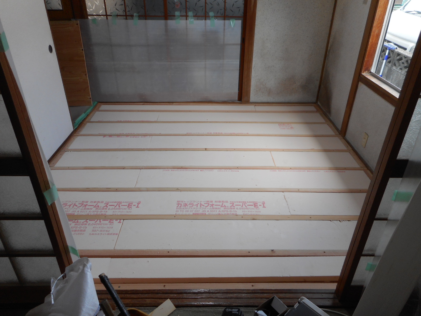 | 下の根太の補強が終わったら、その上のコンパネを施工しました!! | コンパネの上にも根太を施工し、間に断熱材(カネライト40)を入れました!! |