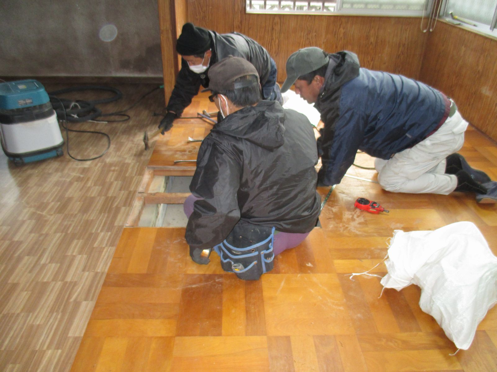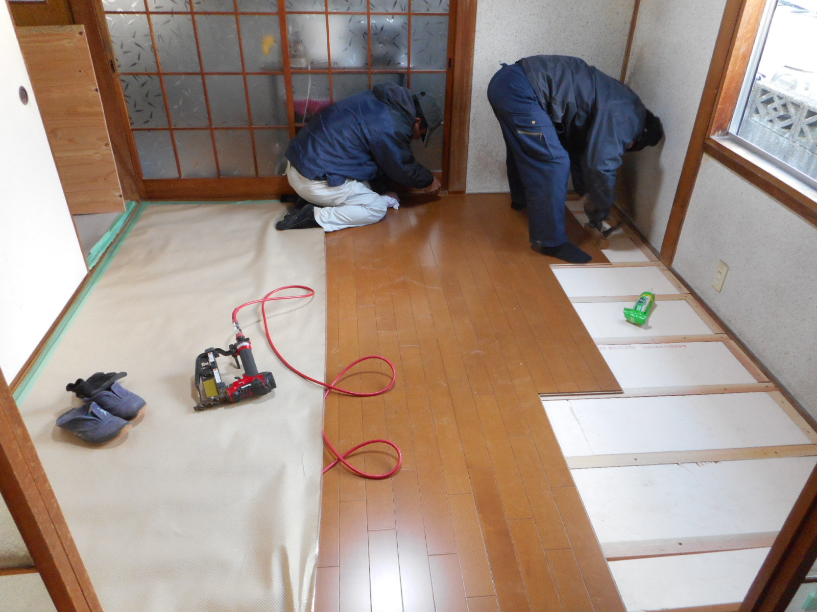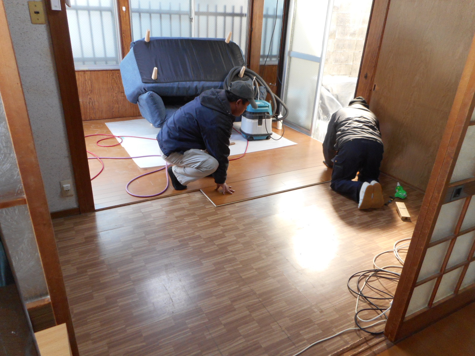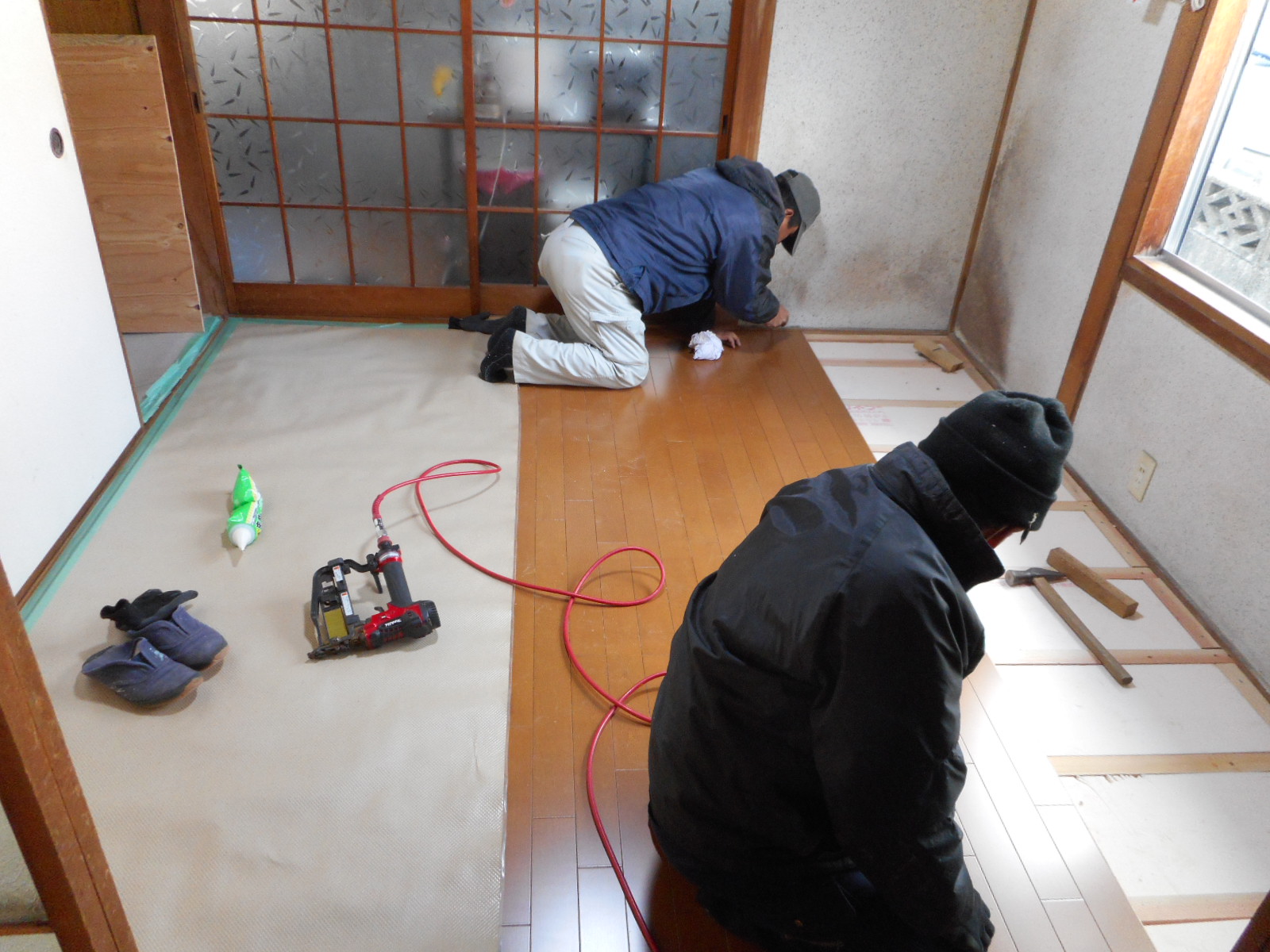 | 既存上部より、新規フロア材を施工します!! | 順次フロア材を施工して行きます!! |