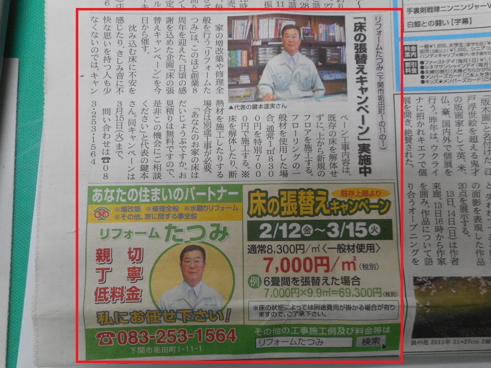 現在下記要領で床の張替えキャンペーンを実施しています。