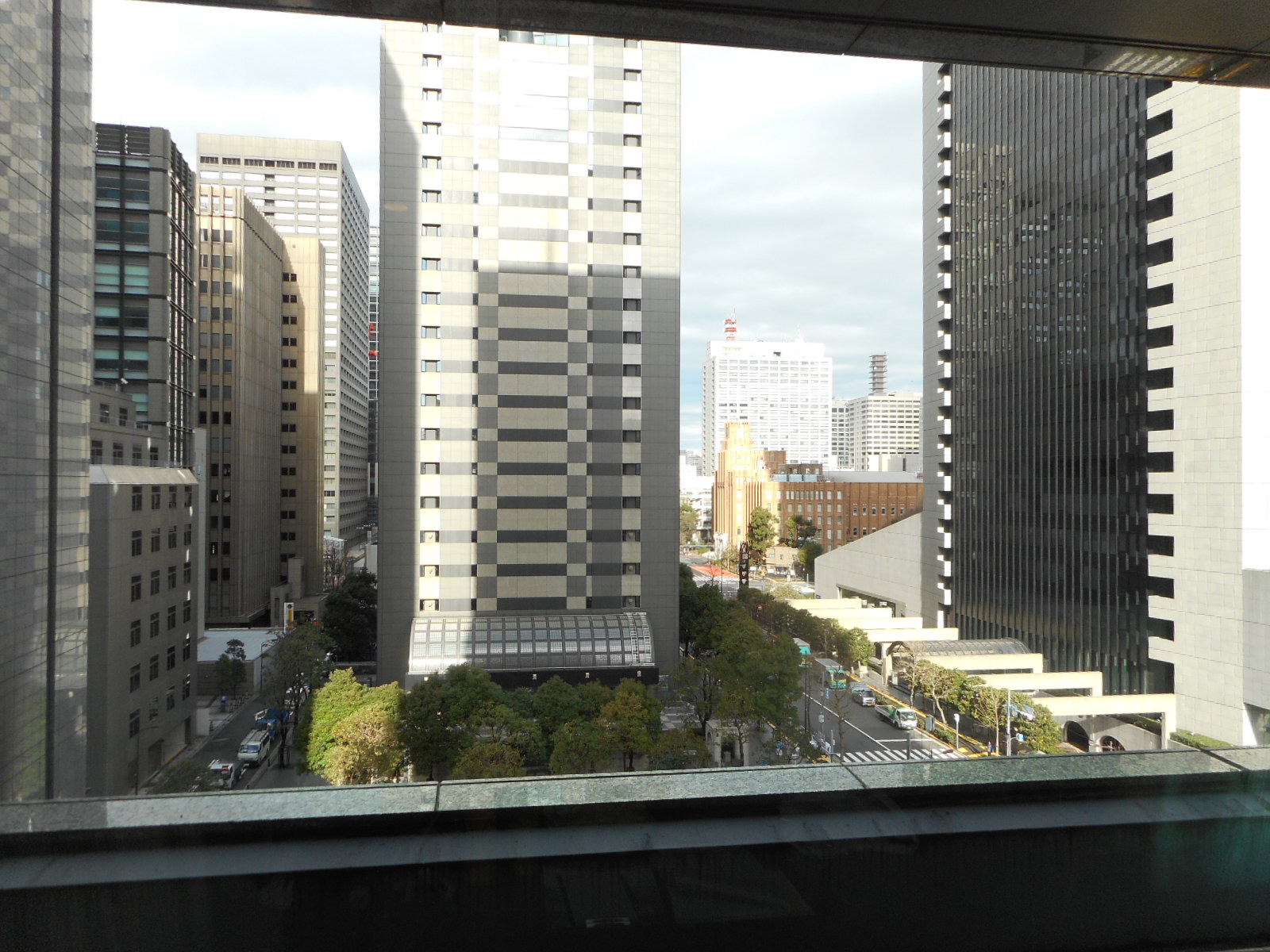 PM9:45分に東京駅に戻り、予約をしていた新橋駅近くのホテルに行きました(翌朝私達が宿泊した5階の部屋から見た外の風景です<日比谷公園方面>!!